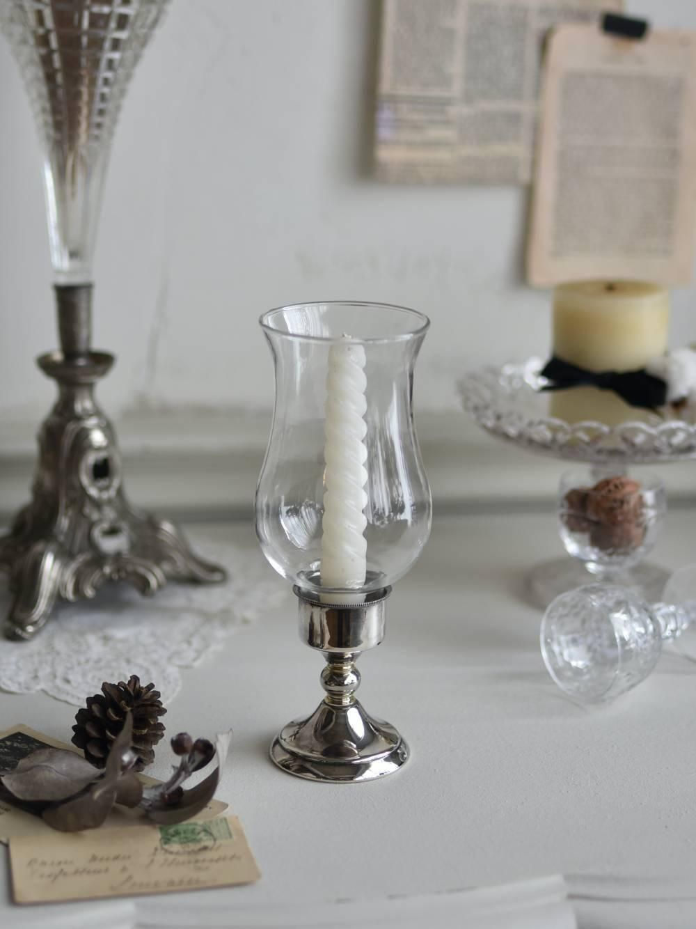 フランスのキャンドルスタンド。 チューリップのようなフォルムのガラスカバー(ホヤ)が可愛らしく、まるでオイルランプのようなデザインが魅力的。土台部分はシルバーカラーとなっており、ガラスとの組み合わせが涼やかでスタイリッシュな印象をもたらしてくれます。ガラスカバーは土台に差し込んでいる状態なので簡単に取り外しができ、お手入れもしやすい作りに。 キャンドルをさしてキャンドルホルダーとしてはもちろん、ドライフラワーなどを飾るディスプレイ小物としても可愛らしいアイテムです。 ディスプレイで使用したキャンドルは付属しません。 直径 約8.5cm H 約21.5cm 差し口 約2cm