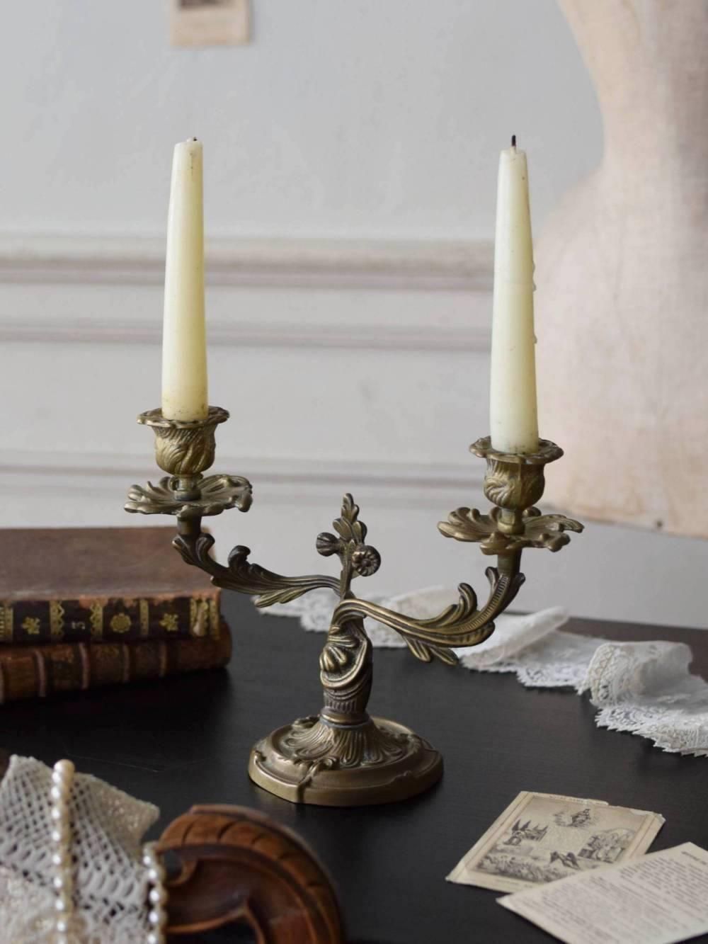フランスの2灯キャンドルスタンド。 葉をモチーフにした豊かなアームが左右に大きく伸び、躍動感のある姿。蕾や小花のモチーフも見られ、生命の力強さを感じさせてくれますね。ブロンズ製で安定感もあり、経年により深みを帯びたゴールドが落ち着きのある美しさを見せてくれます。ろうそくに灯りを灯せば、ますますの雰囲気が高まる演出をお楽しみいただけますよ。 同じデザインのものがもう一点あるので(2灯キャンドルスタンド.6A)ペアでお使いいただくのもおすすめです。キャンドルは付属しません。 W 約22cm 土台直径 約9.5cm 高さ 約17.5cm 口径 約2.2cm
