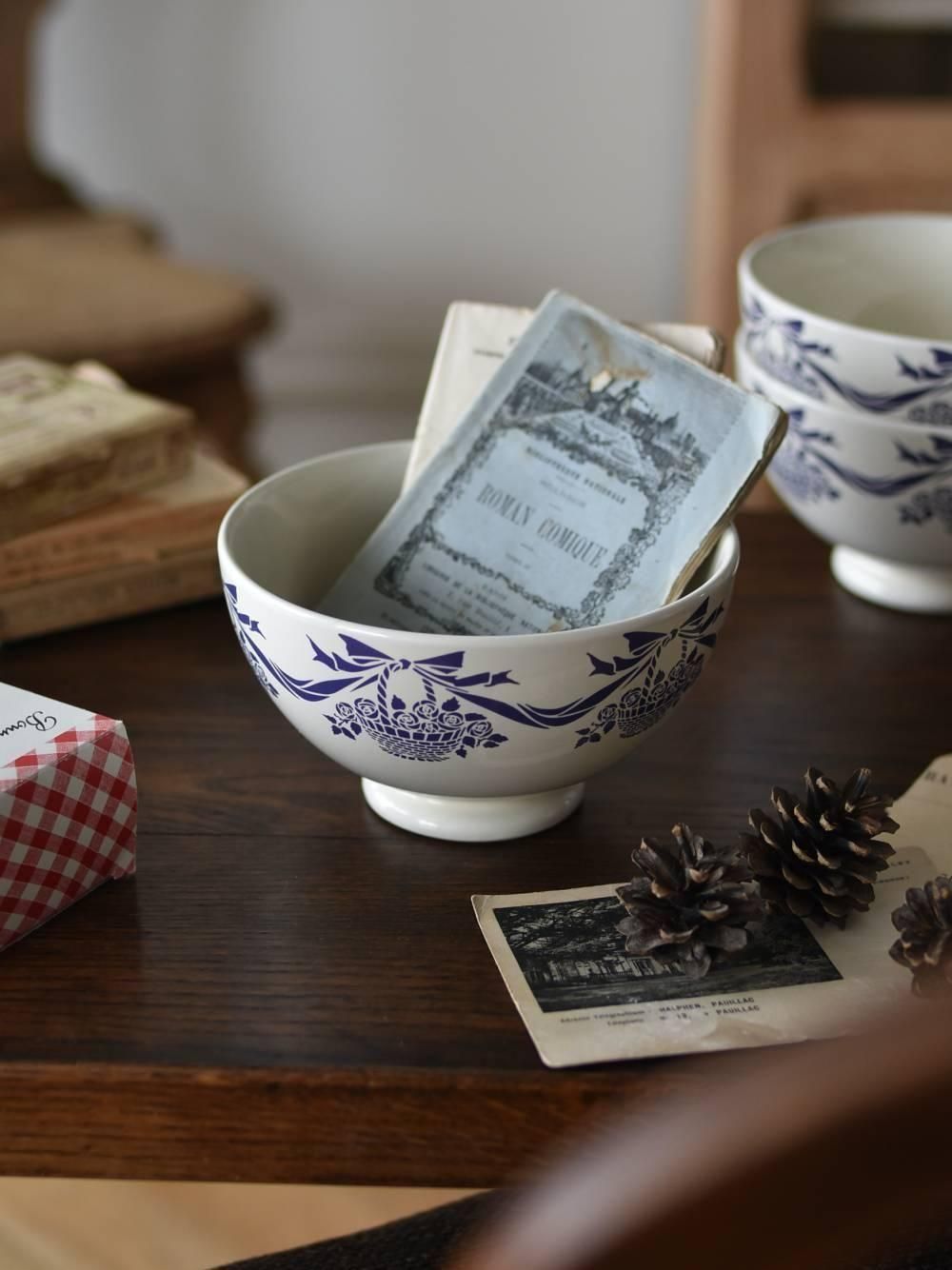 ぽってりとした厚みのあるフランスのカフェオレボウル。 アイボリーカラーのボディに深いネイビーで描かれた模様がどこか優しげで爽やかな印象の佇まい。薔薇があふれるバスケットをモチーフとしており、ハンドル部分できゅっと結ばれたリボンが可愛らしいデザインです。直径15.5cm程とちょっぴり大きめのサイズ感で、雑貨を入れたりなどディスプレイとしても活躍してくれそう。 同じデザインのカフェオレボウルと揃えてのご使用もまとまりが出ておすすめです。 直径 約15.5cm H 約9cm 口径 約14.5cm