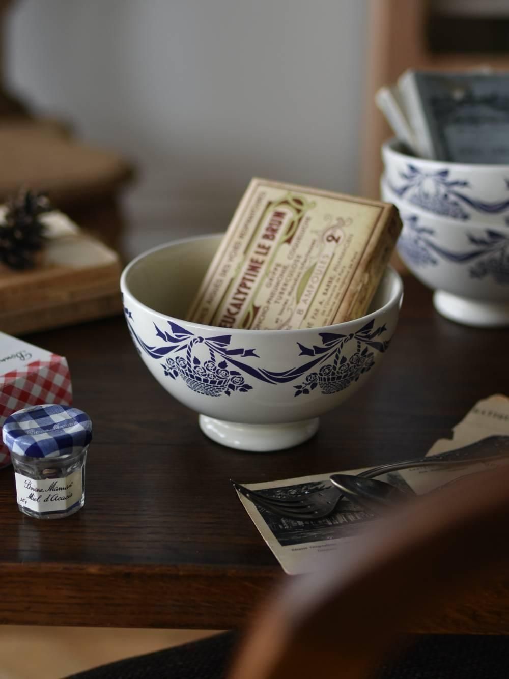 ぽってりとした厚みのあるフランスのカフェオレボウル。 アイボリーカラーのボディに深いネイビーで描かれた模様がどこか優しげで爽やかな印象の佇まい。薔薇があふれるバスケットをモチーフとしており、ハンドル部分できゅっと結ばれたリボンが可愛らしいデザインです。直径15.5cm程とちょっぴり大きめのサイズ感で、雑貨を入れたりなどディスプレイとしても活躍してくれそう。 同じデザインのカフェオレボウルと揃えてのご使用もまとまりが出ておすすめです。 直径 約15.5cm H 約9cm 口径 約14.5cm