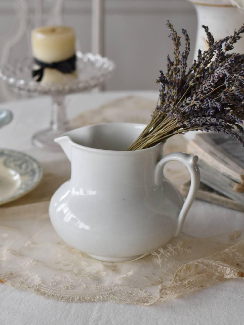 フランスのアンティークピシェ。 爽やかなホワイトに包み込まれた清楚な印象を受け、下部がふっくらとした形状がどこか可愛らしさをもたらしてくれます。しなやかな曲線を描いた持ち手によって、繊細さが兼ね備わった上品な佇まいです。 フラワーベースとしてもお花を雰囲気良く引き立ててくれ、比較的高さが低めなので限られたスペースでも気軽にディスプレイを楽しめそうです。 W 約18cm D 約15.5cm H 約14cm