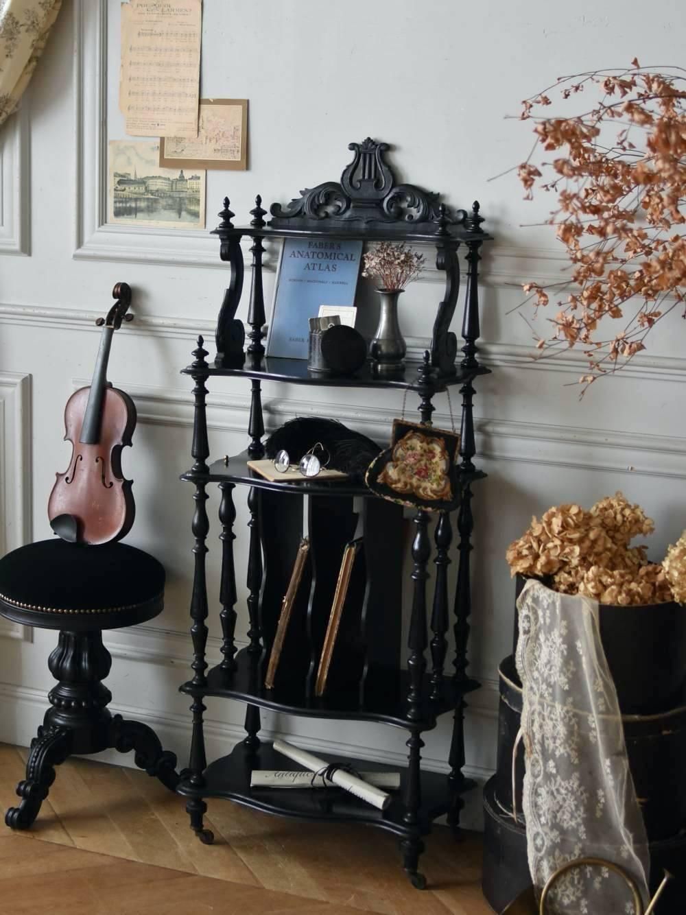 フランスのミュージックシェルフ。 艶感のあるブラックペイントがかっこよく、ピリッとスパイスの効いた空間演出に導いてくれる佇まい。トップにはリラ(竪琴)モチーフの装飾があしらわれ、滑らかな曲線を描く棚板やリズミカルな支柱ラインなど、フランスらしいエレガントなデザインがたっぷりと詰め込まれた美しい逸品です。 脚元のキャスターは現在も動きます。下部に施された縦の仕切りによって、本や雑誌などを整理しながら収める事ができ、機能面も兼ね備わった構造に。 装飾性の高い装いはインテリアとしても絵になり、お部屋の雰囲気をぐっと高めてくれるアイテムです。 W 約50.5cm D 約30cm H 約131cm 棚板間隔(上から) 約23cm/約18cm/約39cm/約18cm こちらの商品の配送について