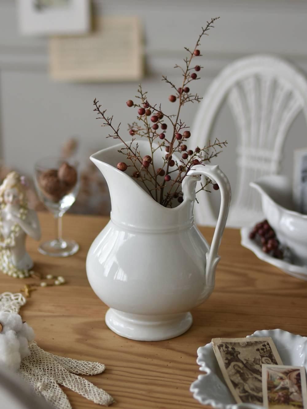艶やかな質感のフレンチピシェ。 ぽってりとした丸みのあるボディに、植物をモチーフとした装飾があしらわれた優雅な印象の佇まい。透けるようなホワイトカラーは上品で、フレンチシックなテーブルコーディネートにも映える美しいデザインです。注ぎ口に小さな欠け、底面が完全なフラットではなく、若干のがたつきが見受けられます。 すっきりとしたシンプルな姿は飾ったお花などをより鮮やかで華やかに演出し、卓上ディスプレイに彩りをプラスしてくれる清楚な雰囲気のアイテムです。 W 約15.5cm D 約13.5cm H 約19cm