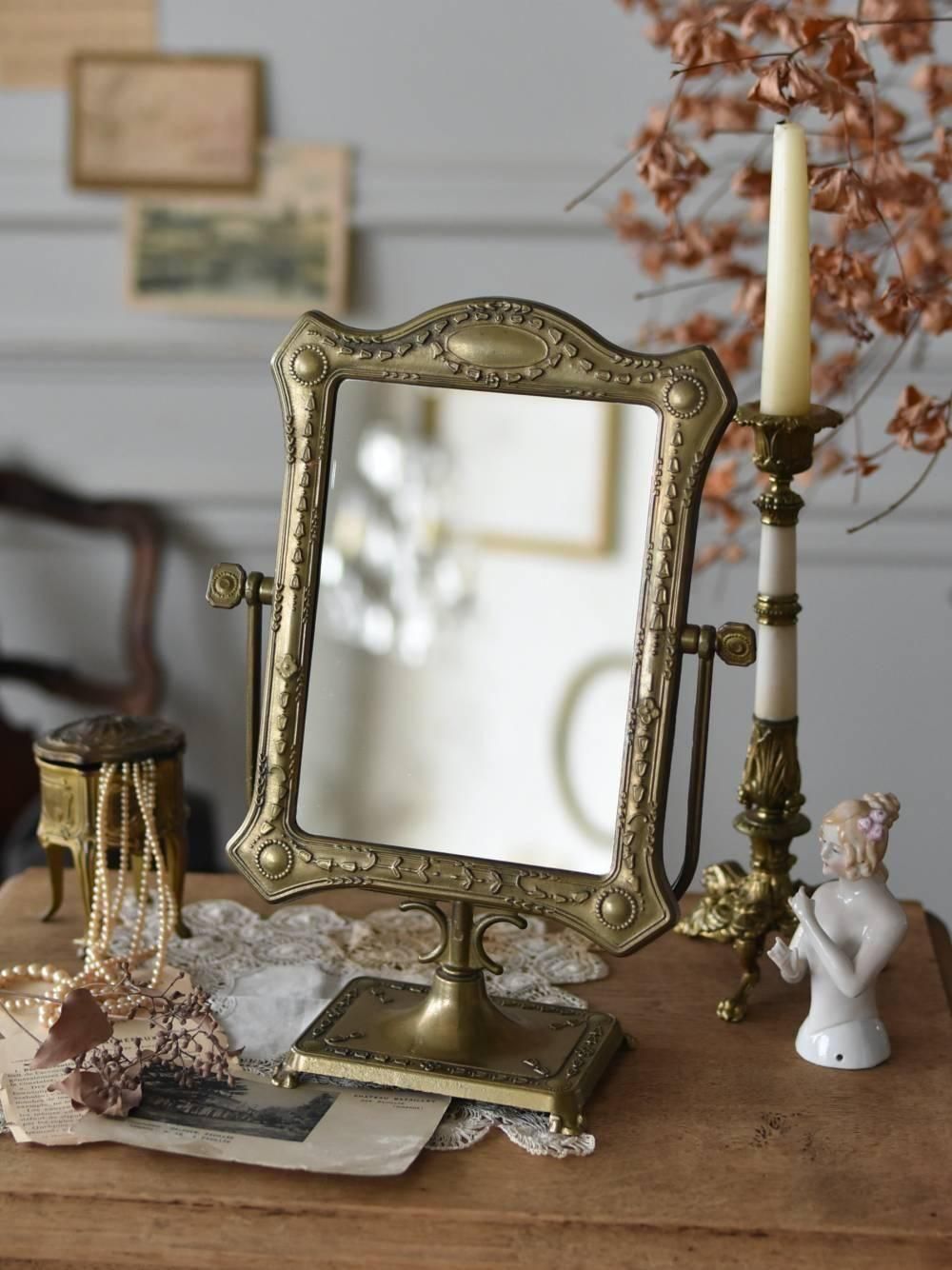 フランスで見つけたスタンドミラー。 マットな質感のゴールドカラーが上品な装いで、ほどよいサイズ感が魅力的。表面には細やかなレリーフがあしらわれ、エレガントな空間演出に活躍してくれる華やかな印象のデザインとなっています。サイドのつまみを緩めると鏡の角度調節ができる使い勝手の良い逸品に。ミラーにキズ、わずかな歪みが見受けられます。 ミラーが四角いタイプで甘すぎず、クラシカルな空間作りにもおすすめのアイテムです。 W 約23.5cm D 約10cm H 約33.5cm ミラー W約13.7cm×H約19.5cm