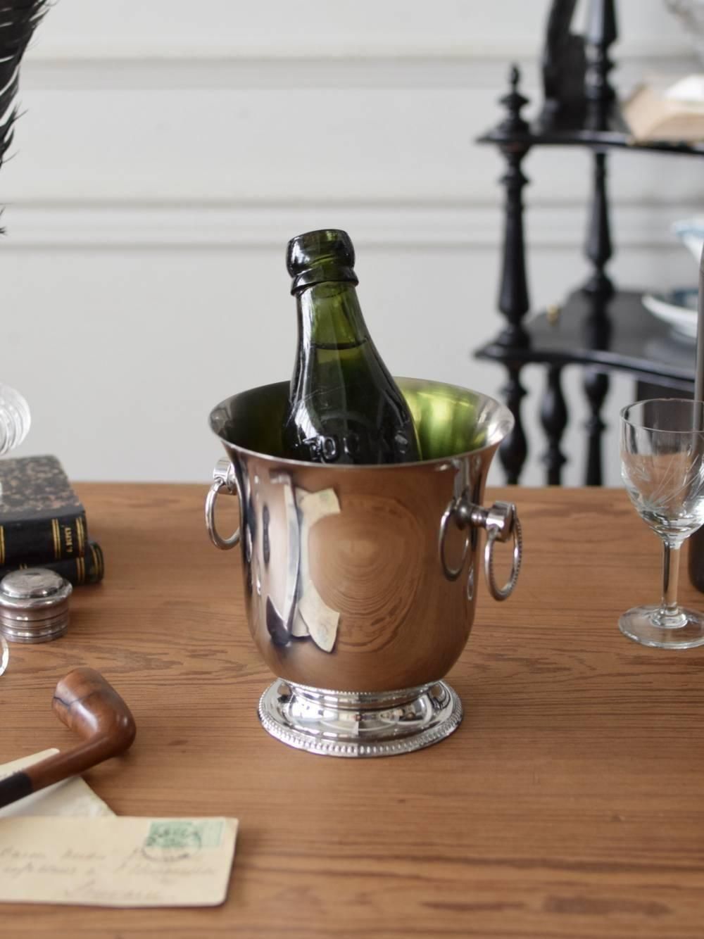 珍しい小さめサイズのワインクーラー。 フランスのキッチンウェアブランド Guy Degrenne社(ギ・ドグレーヌ)のもので、表面はミラーのような艶やかな仕上げになっており、とても表情豊か。ベル型のような滑らかなフォルムが光の屈折を生み、ゆらゆらとした反射がどこか幻想的です。 表面には傷やくすみなどありますが、古いものならではの豊かな風合いをお楽しみください。同じデザインで大小2つ並んだ姿も素敵ですね。こちらは小さい方のサイズで、375mlほどのハーフサイズのワインボトルがちょうど収まる大きさです。 W 約14.5cm D 約13.8cm H 約14.5cm 口径内寸 約11 × 深さ13cm