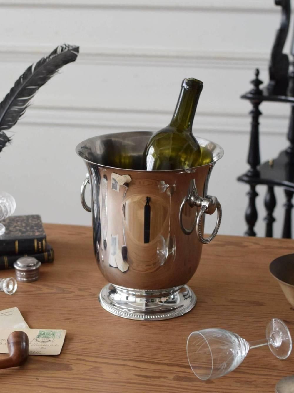 艶やかな光沢が美しいワインクーラー。 フランスのキッチンウェアブランド Guy Degrenne社(ギ・ドグレーヌ)のもので、表面はミラーのような艶やかな仕上げになっており、とても表情豊か。ベル型のような滑らかなフォルムが光の屈折を生み、ゆらゆらとした反射がどこか幻想的です。 表面には傷やくすみなどありますが、古いものならではの豊かな風合いをお楽しみください。同じデザインで、大小2つ並んだ姿も素敵ですね。こちら大きい方で、750mlのワインボトルがちょうど収まる一般的な大きさです。 W 約21cm D 約20.2cm H 約22.5cm 口径内寸 約16 × 深さ20cm