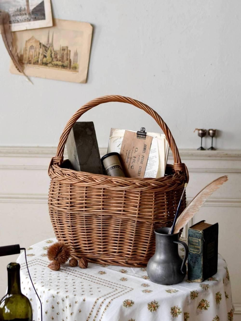 フランスのナチュラルバスケット。 大きなハンドルを持ち、ころんと丸く愛らしい姿。上から覗くとオーバルのような形状になっており、奥行きは控えめですが、深さがそれなりにありますので、ボトルなど長細い形状のものもバランスよく収めていただけます。 底の部分に一部木の割れが見られますが、全体にしっかりと編まれているので、ご使用には問題ない程度。ナチュラルな素材感、使い込まれた味わいも魅力の一つで、ディスプレイや収納におすすめです。 W 約42cm D 約28cm H 約47cm 深さ 約24cm