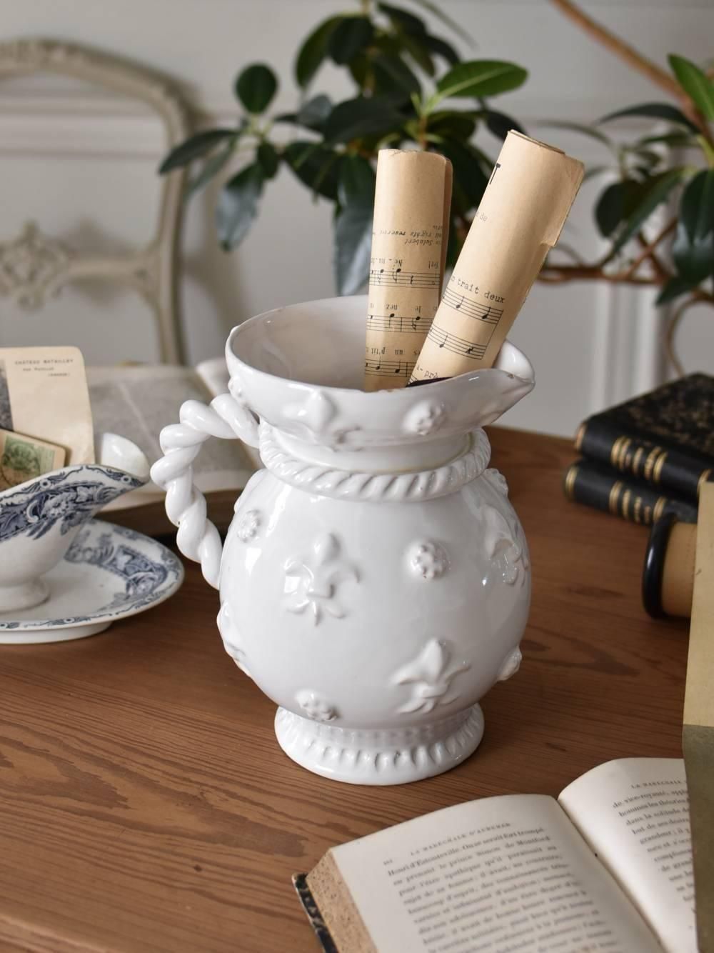 フランス・マリコルヌ窯のアンティークピシェ。 ぷっくりと立体的になったフルール・ド・リスが散りばめられた格式高いデザインにボタンのような丸い模様も合わさり、置いているだけでも見入ってしまうような存在感があります。ホワイトの釉薬からうっすらと素地の色味が浮き上がって見える、ピンクがかったような温かみのある色合いも魅力的です。 開口部分に欠けが見受けられます。持ち手部分は捻られた紐を連想させるようなユニークな一面もあり、手仕事ならではの細工によって様々な表情が楽しめます。 W 約19.5cm D 約15cm H 約21cm