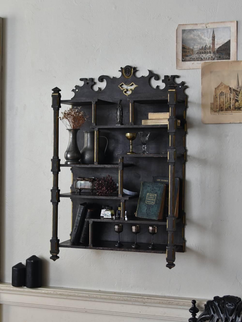 フランス・ナポレオン3世時代のペイントウォールシェルフ。 マットなブラック×ゴールドのシックな配色が特徴的で、多段に分かれた個性的な造形が魅力的。飾ったものをまるでアートのように魅せることが出来る美しいデザインで、壁面をより華やかに演出してくれます。上部に開けられた穴にネジなどを差し込んで壁面に固定する構造に。 独自の雰囲気をたっぷりと楽しめる唯一無二の姿で、クラシカルな空間作りにもぴったりなかっこいいアイテムです。 W 約50cm D 約19.5cm H 約78.5cm 重量 約4kg こちらの商品の配送について