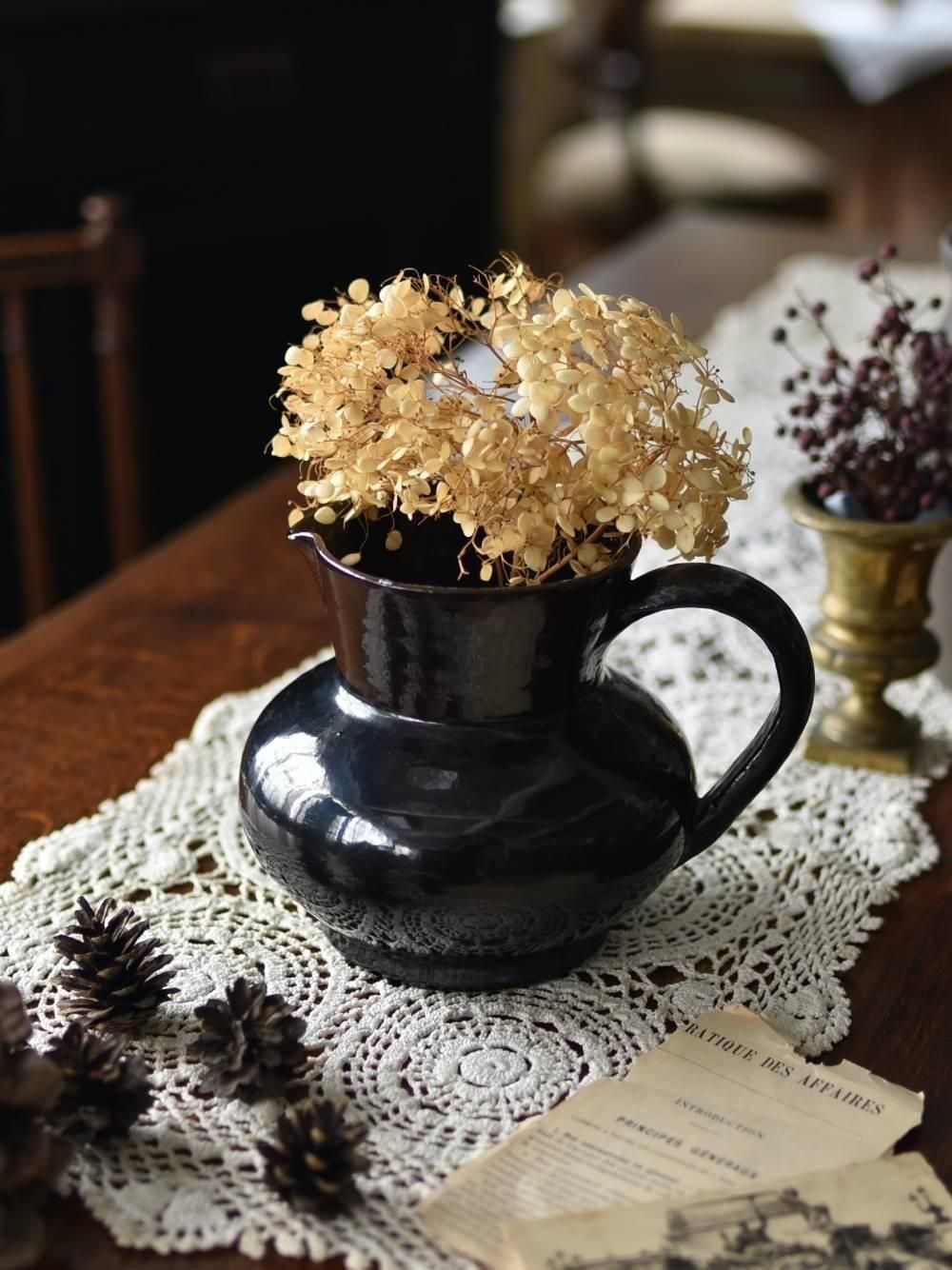フランスのアンティークピシェ。 艶やかな釉薬がとろりとかけられ、わずかに金属光沢のような表情が楽しめる独自の質感が特徴的。色味は下地のブラウンがやや透けるブラックカラーで、ぽってりとした丸みのあるシルエットが可愛らしくもやや渋さを感じられるデザインとなっています。 お水を入れて生花を飾るフラワーベースとしてもおすすめで、深みのある色合いが挿したものをより鮮やかに演出してくれるアイテムです。 W 約20cm D 約17cm H 約15.5cm 口径 約11cm