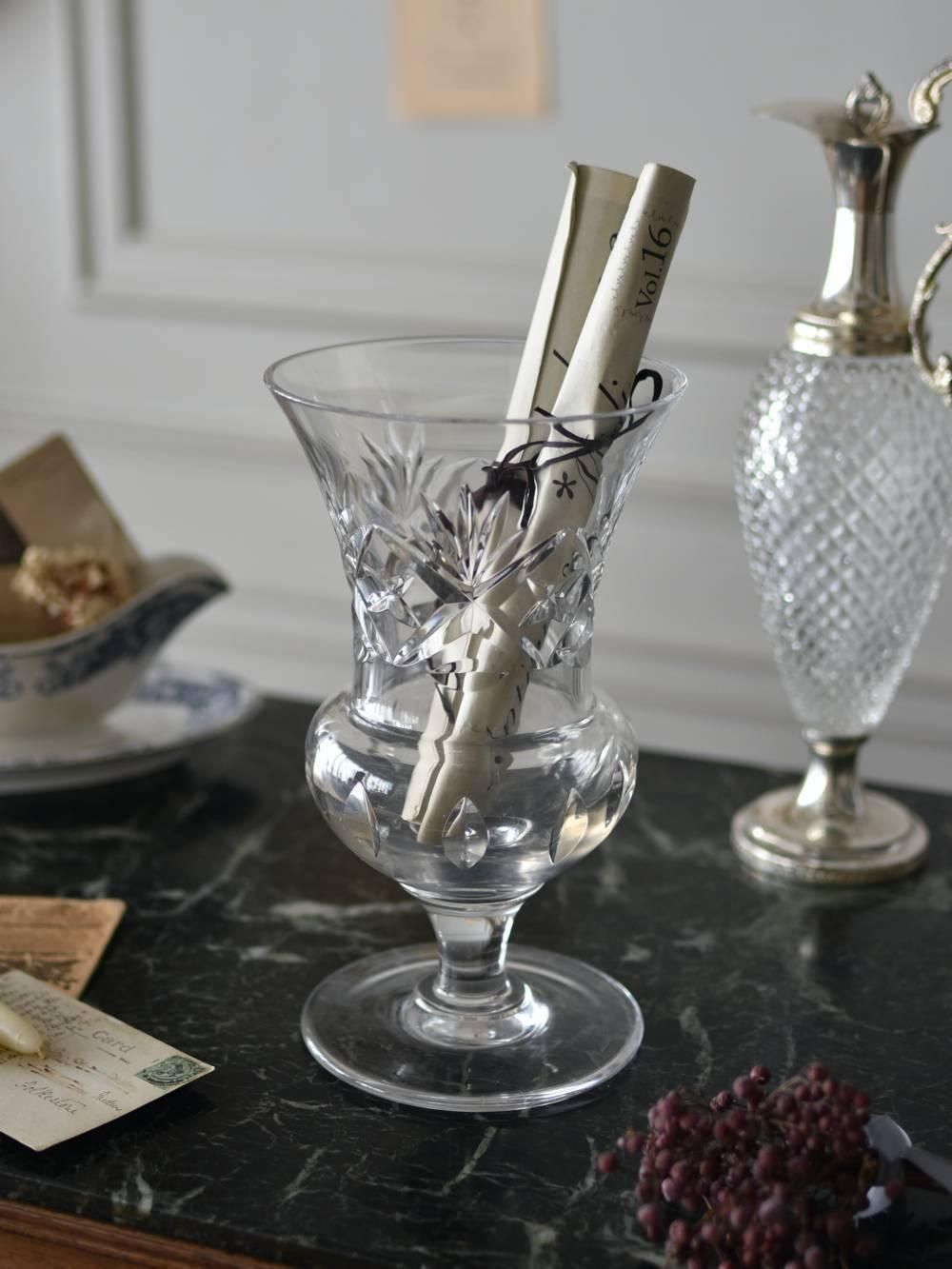 フランスのガラスフラワーベース。 透き通るようなガラス製で、涼やかな印象と軽やかな雰囲気を漂わせてくれる佇まい。しっかりとした厚みのあるボディ表面には美しいカット模様が繊細にあしらわれ、光を反射して煌めく華やかなデザインとなっています。 比較的大きめサイズで存在感もあり、お花をさしてテーブルコーディネートに彩りをプラスしてくれるアイテムです。 直径 約16cm 脚元直径 約13.7cm H 約27.5cm 口径 約14.8cm