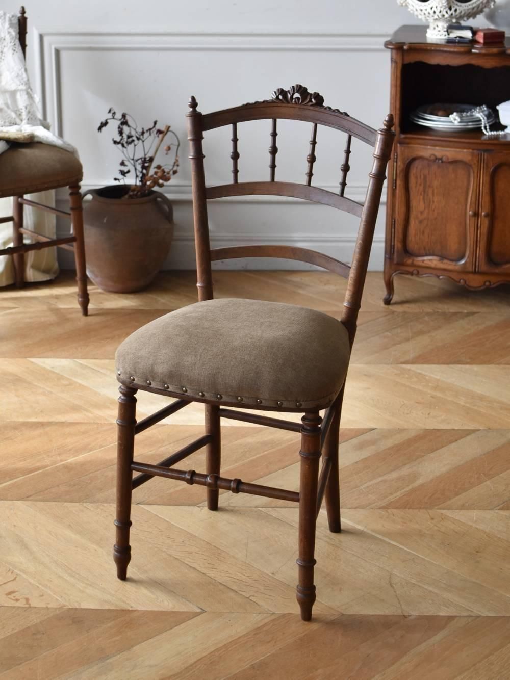 フランスのアンティークチェア。 背もたれトップ下に並んだ縦ラインにぷっくりとした球体がリズミカルにあしらわれ、幅のあるすっきりとした横のラインとがバランス良く組み合わさっています。すっきりとした脚元に節のあるデザインが気品高く、落ち着いた色合いのブラウンカラーによって優しげな雰囲気を漂わせてくれます。 フフレームは一度バラして組み直しを行っています。座面のファブリックは新しく張り直し、中もウレタンに交換しているので沈み込みすぎない程よい柔らかさのある座り心地となっています。 それぞれでの販売となりますが、同じデザインのアンティークチェア.Aがあるので、ペアとして揃えるのも雰囲気がまとまりおすすめです。 W 約42cm D 約45cm H 約91.5cm 座面まで 約50cm こちらの商品の配送について