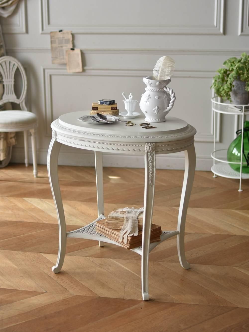 フランスのペイントオーバルテーブル。 ほんのりグレーがかった淡い色味が上品で、しなやかな曲線を描く脚元や滑らかなオーバルシルエットの天板がフランスらしい優雅な佇まい。表面には小花から垂れ下がるような植物レリーフ、ぐるりと縁を囲うリボンツイストが繊細に彫り込まれており、丁寧な作り込みが窺えるデザインとなっています。下部には籐張りの棚が設けられ、ディスプレイも楽しめる逸品に。 華奢なラインが軽やかさと抜け感を演出し、フレンチシックな空間に映えるフェミニンな印象のアイテムです。 W 約74.5cm D 約55.5cm H 約77.5cm(幕板までのH 約68.8cm) 棚板間隔 約47.5cm こちらの商品の配送について