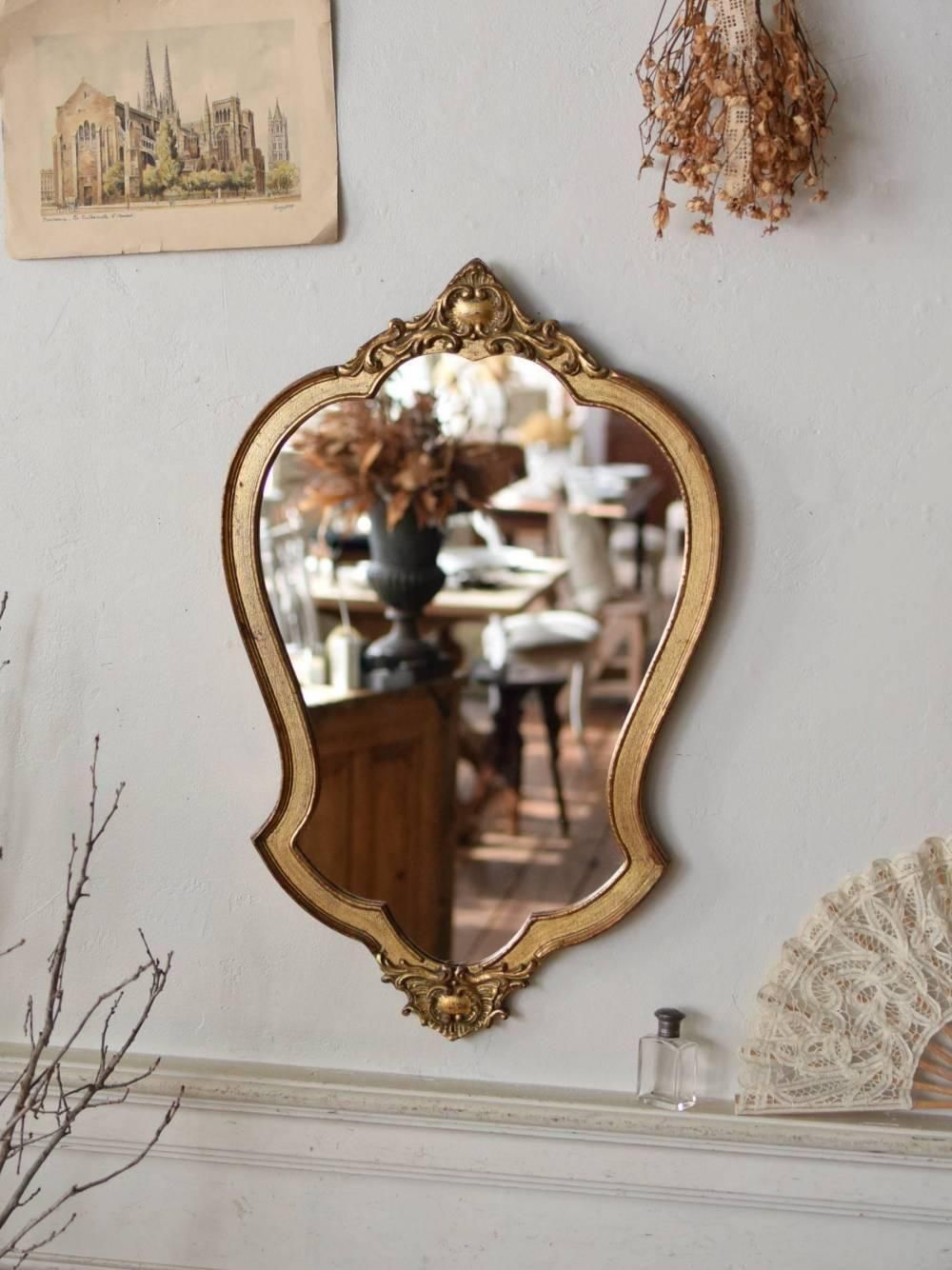 フランスのデコレーションミラー。 明るめのゴールドにまとまり、シンプルながらも力強いフレームのラインがくっきりと映え、壁面を印象付けてくれます。上下には、シェルや葉をモチーフとした躍動的な装飾が施され、立体感のある繊細な美しさ。ミラーは新しいものに交換しています。 個性的なフォルムがアクセントでありながら、空間に奥行きをもたらしてくれるので、グッと雰囲気の高まる演出をお楽しみいただけます。 W 約45cm D 約2.5cm H 約70.5cm 内寸 W約38cm×H約54cm 重量 約2.2kg
