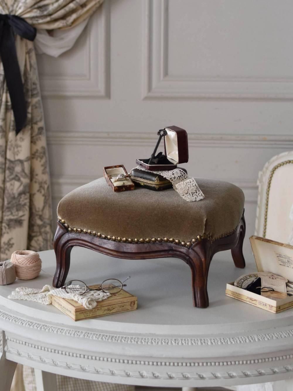 フランスのフットスツール。 ちょこんした短めの脚は波打つような優雅な曲線を纏い、美しさの中にも愛らしさが漂いますね。ファブリックはスモーキーブラウンのような落ち着いたシックなカラー。少し光沢のあるベロア生地は、上品でありながらどこか温かみも感じさせてくれます。 コンパクトながらも強度があり、小さな腰掛けとしても使用できそうですが、卓上などに飾って、ディスプレイ台としてもおすすめです。 W 約31cm D 約29cm H 約19cm