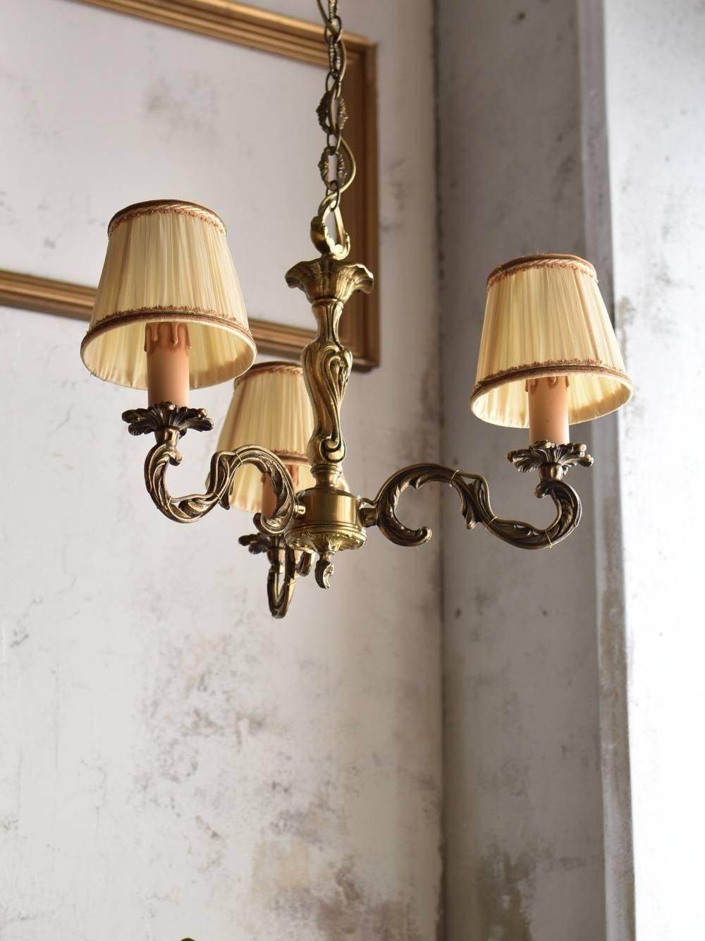 フランスの3灯シャンデリア。 それぞれの光を淡いクリームカラーの細やかなプリーツがあしらわれたシェードが包み込むような、可憐な雰囲気を纏っています。アーム部分は植物モチーフとなった凛とした力強さを感じさせてくれるデザインで、深みのあるゴールドカラーと相まって甘すぎないキリッと引き締まった印象も受けます。 コード・ソケット・シーリングは新しいものに交換済みです。こちらの商品は条件を満たしているので引掛シーリングをご使用いただけます。元は直付けで使われていた物で天井カバーが浅い為、天井との間に隙間ができます。天井との隙間が気になられる方は直付け工事をおすすめします。 電球は付属しません。 直径 約39cm H 約32cm コード含む全長 約66cm 重量 約2.6kg 電球口径 E17 *60W以下をご使用下さい。 40W×3灯=120W