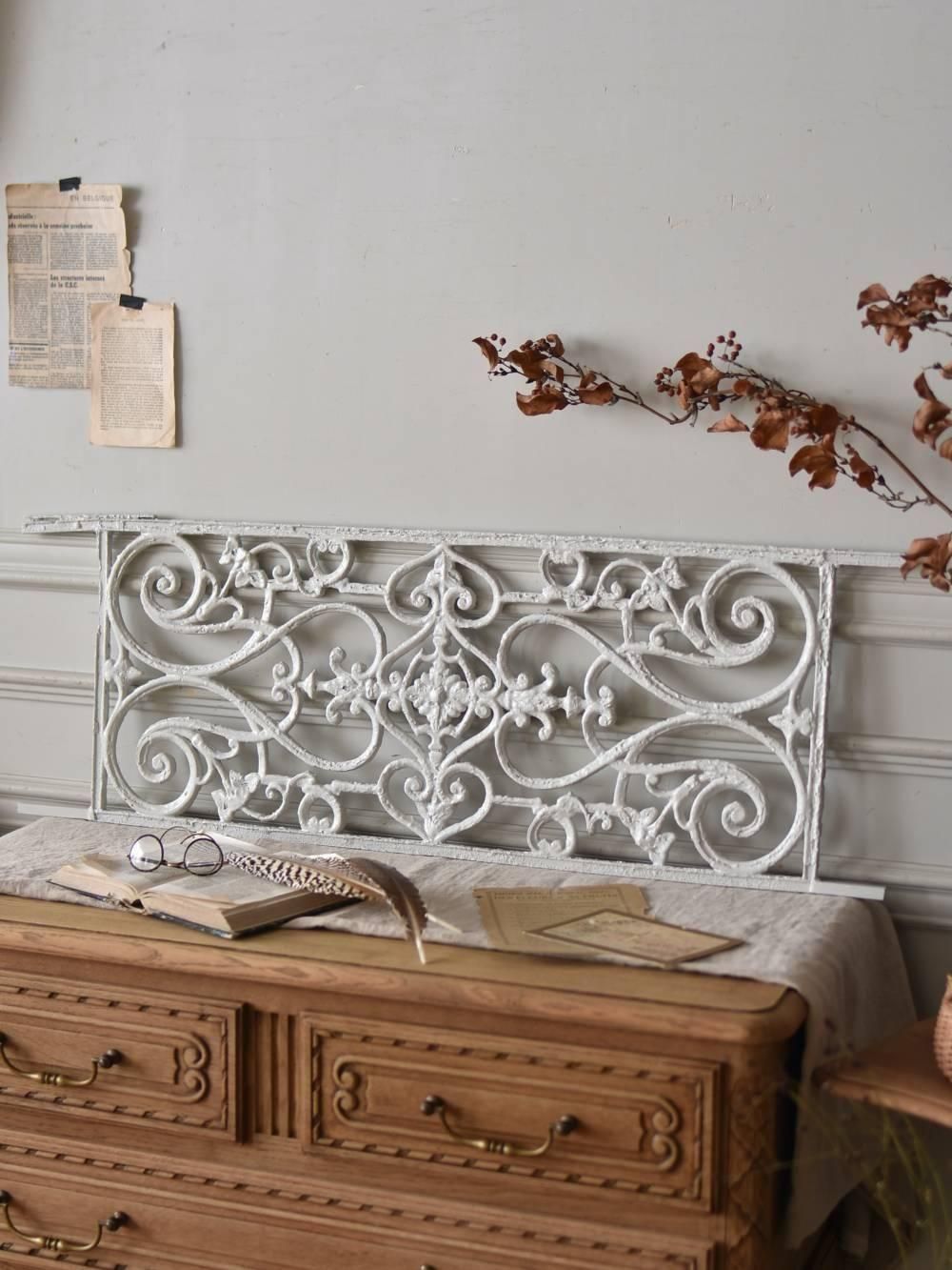 何度も塗り重ねられたような独自の表情が唯一無二のフレンチアイアンパネル。 明るいホワイトカラーにペイントされており、華奢ながらも鋳物ならではの重厚感が楽しめる佇まい。植物のしなやかなラインと細やかな葉をモチーフとしたエレガントなデザインが魅力的で、フランスらしい優雅さとどこか可憐な印象をもたらしてくれます。装飾部に小さめの欠損が見受けられます。 装飾性が高くパッと目を惹く姿で、壁面に立てかけて置くだけでも独自の存在感を漂わせてくれるアイテムです。同じデザインのものがもう1点ございます(アイアンパネル)。 W 約110cm D 約2cm H 約38cm 重量 約11.5kg