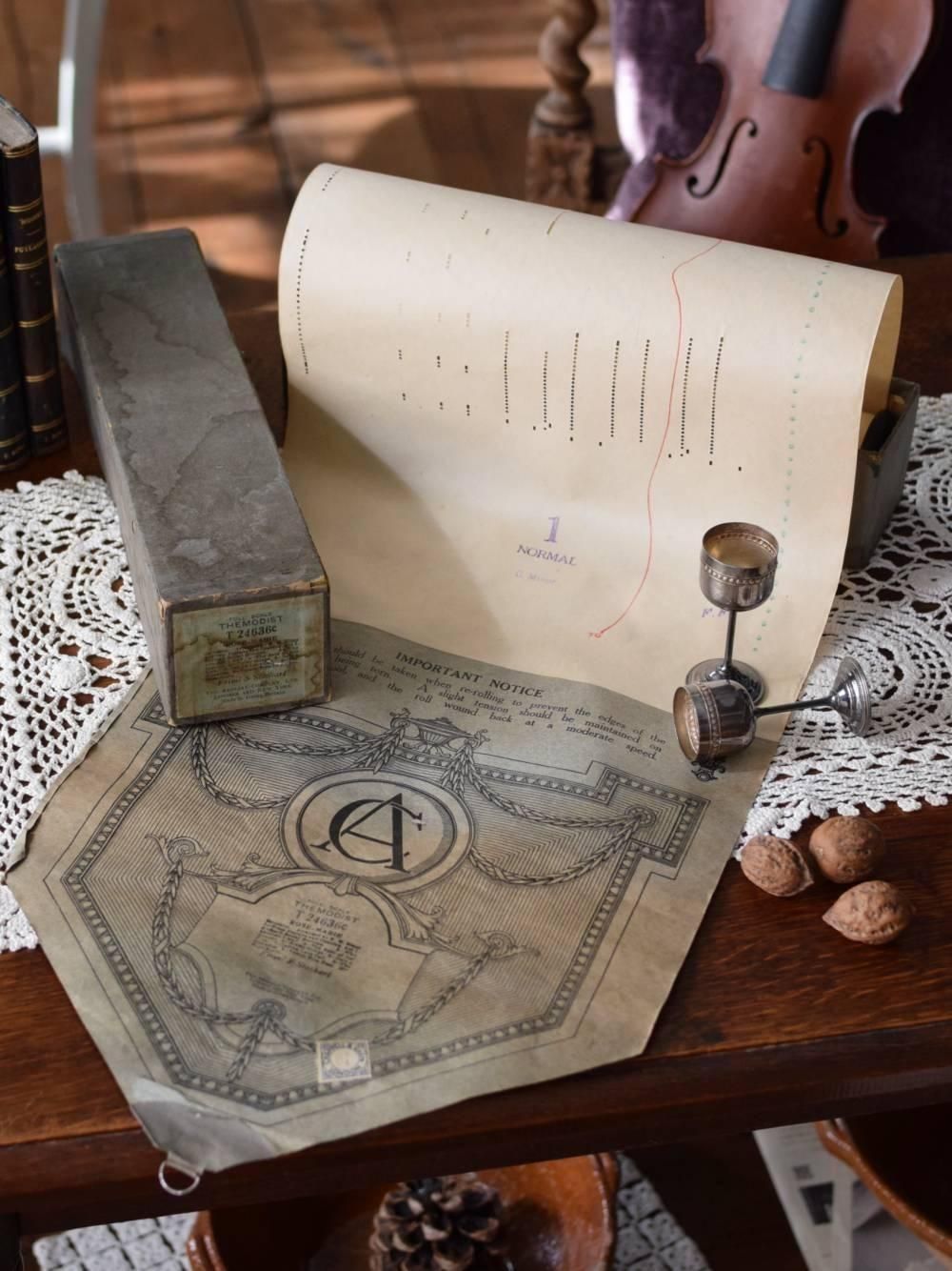 イギリスのミュージックロール。 自動演奏ピアノを奏でる際に用いられる紙製の巻物で、まるでオルゴールのようなユニークな音符代わりの穴が並んでいます。こちらはミュージカル「ROSE-MARIE」の抜粋曲集。長い時を経た巻物は年季を帯びていますが、古いものならではの魅力が詰まっていて、敷いたり、垂らしたりと幅広いディスプレイに活躍してくれますよ。 こちらは箱付きで、収納することが可能。曲は異なりますがもう一点同じシリーズで、箱なしのものがございます。(ミュージックロール) W 約31cm 直径 約6.5cm BOXサイズ W約32cm×D7.3×H7cm