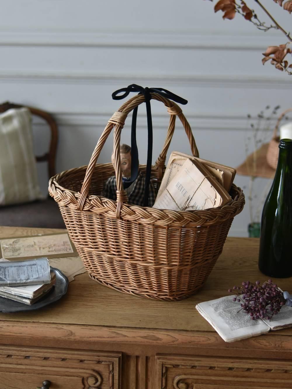 フランスのナチュラルバスケット。 1つ1つ手作業で編み込まれた温かみのある姿で、素材のラタン(籐)ならではの素朴な表情が魅力的。二股に分かれたハンドルの造形や部位によって編み方の異なるデザインが可愛らしく、お気に入りのファブリックなどをかけて見せる収納としても絵になります。片側の付け根の補強部分がほつれているものの、全体にしっかりと編まれ、強度には問題ありません。 ころんとした丸みのあるシルエットで程よい大きが使い勝手よく、ナチュラルな空間作りの一員として活躍してくれるアイテムです。 W 約42cm D 約28cm H 約38cm 深さ 約19cm