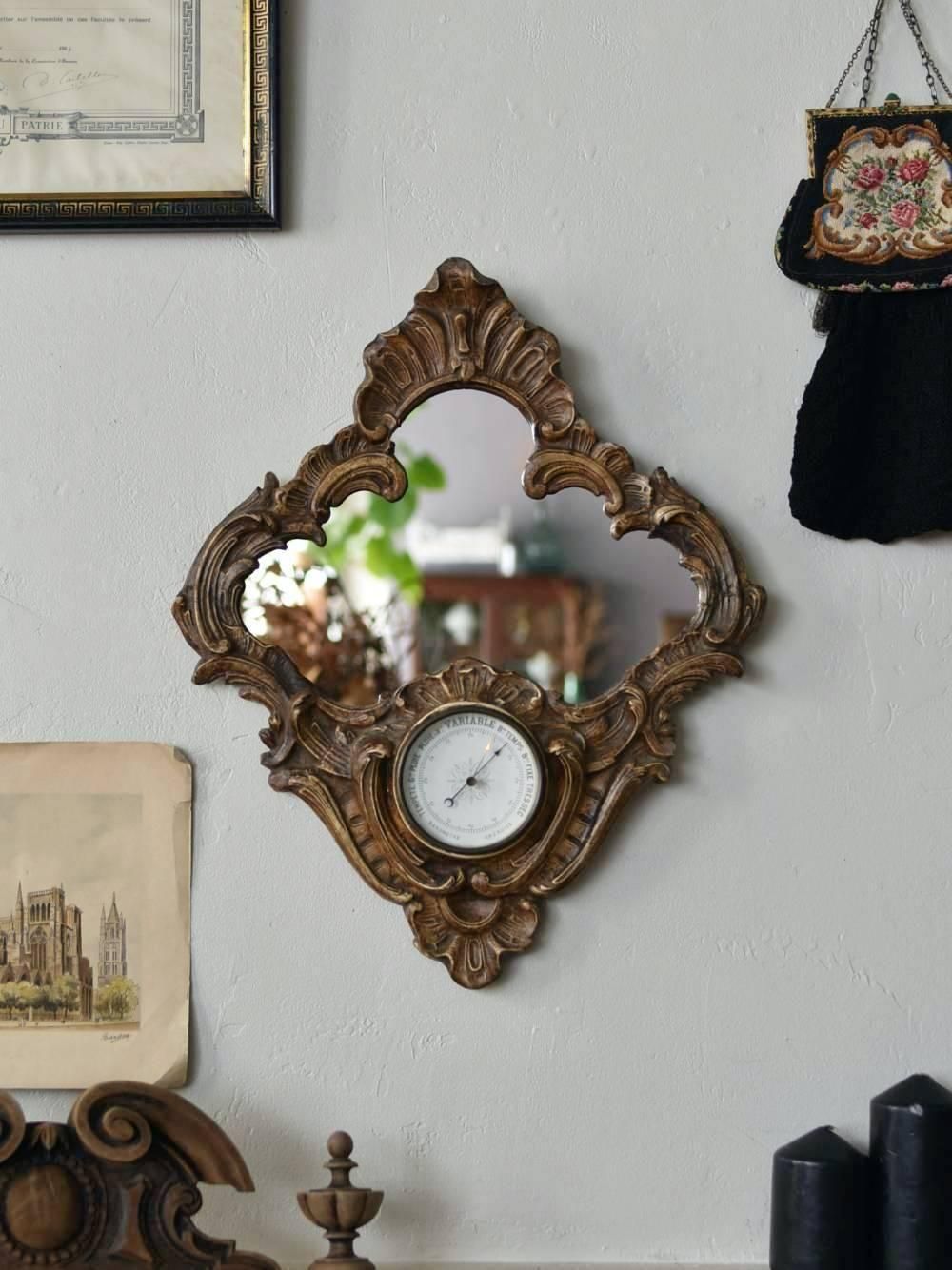 フランスのバロメーター付きミラー。 濃淡のあるブラウンに色付けされた石膏フレームはシェルモチーフの優雅な姿で、有機的なラインを描くデザインが魅力的。上部にはミラー、下部にはアネロイド型気圧計がはめ込まれており、その個性的な造形がパッと目を惹きます。気圧計は現在動いておりませんが、オブジェとして雰囲気たっぷりな逸品に。 しっかりとした存在感のある大きさで、壁面のアクセントとして活躍してくれるクラシカルな印象のアイテムです。 W 約42cm D 約4cm(+金具1cm) H 約51cm ミラー W約32cm×H約18.5cm 重量 約2kg