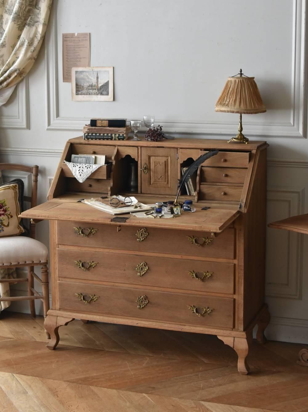 フランスのライティングビューロー。 剥離されたオーク材の豊かな表情と明るくもラフすぎない色味が魅力的。天板兼扉の表面には凹凸のはっきりとしたモールディング、鍵穴や取手には自然をモチーフとしたロカイユ装飾があしらわれ、優雅さと格式高さを感じられるデザインとなっています。サイドにある棒を引き出して天板を下ろすと読み書きが出来るスペースが生まれるユニークな構造に。 大小それぞれで合計11杯の引き出しが設けられ、細かなものもしっかりと仕分けて収納できる見た目だけではなく機能性にも優れたアイテムです。 ボディ W 約103.5cm D 約48.5cm(天板を下ろした際のD 約79cm) H 約102.5cm(天板までのH 約76cm) 内側扉内 W約19cm×D約18cm×H約22.3cm 引き出し内寸 (内側サイド) W約21.5cm×D(上)約16cm(中)約19.5cm(下)約22.7cm×深さ約5cm (内側中央) W約8.2cm×D約16.2cm×H約3cm (下部3段) W約84.5cm×D約39.3cm×H約12cm 搬入経路について こちらの商品の配送について