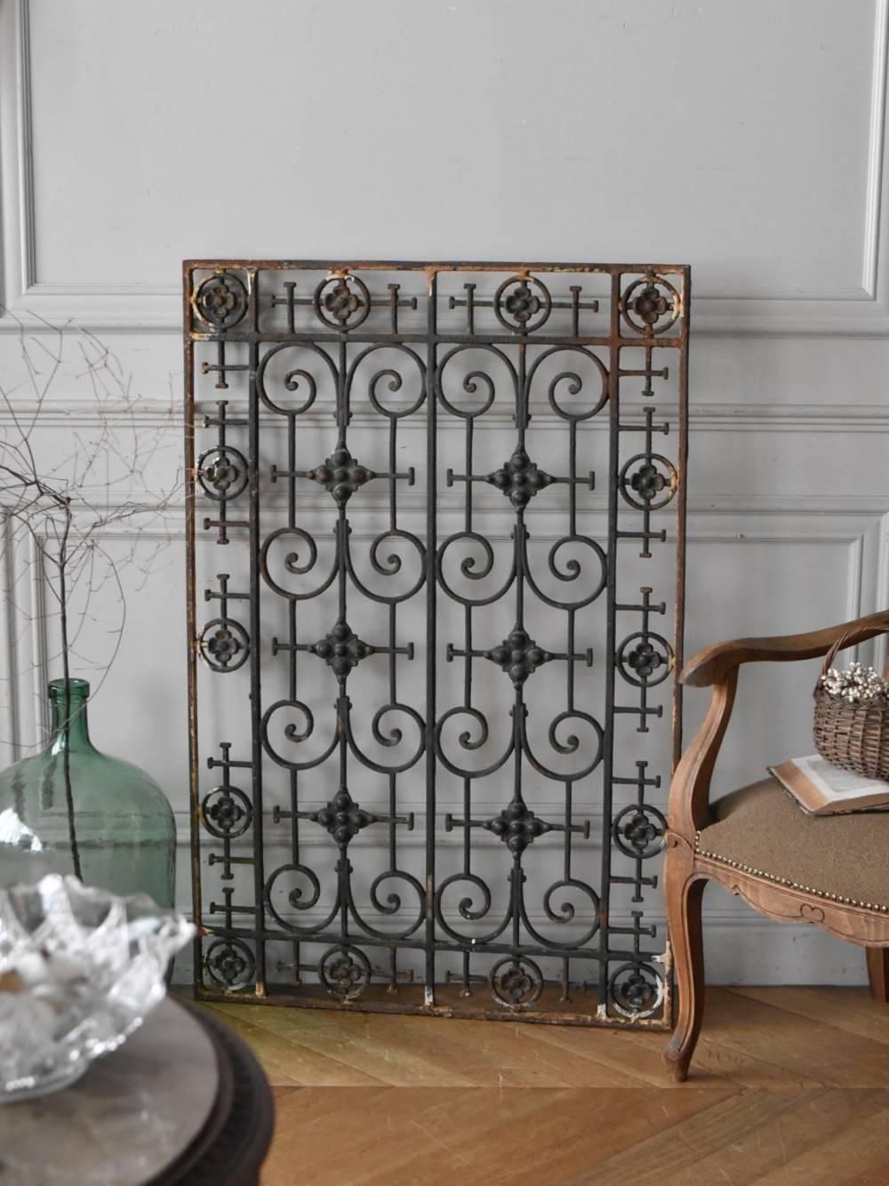 フランスのアイアンパネル。 お花をモチーフとしたデザインをアクセントに、曲線と直線が組み合わさった幾何学的な連続模様によって端麗な美しさが感じられます。年季の入った深みのあるグリーンの色合いがどこか厳かな雰囲気を纏い、塗装の剥がれやホワイトのペイントが付いていたりと、当時の風景が浮かんできそうな趣のある姿です。 古いものですので一部欠損が見受けられますが、縦横どちらでも使用できます。しっかりとした厚みのあるアイアンによって遠くからでも存在感を放ち、壁などに映し出される影さえもうっとりさせてくれそうです。 W 約75.5cm D 約3cm H 約116cm 重量 約30kg こちらの商品の配送について