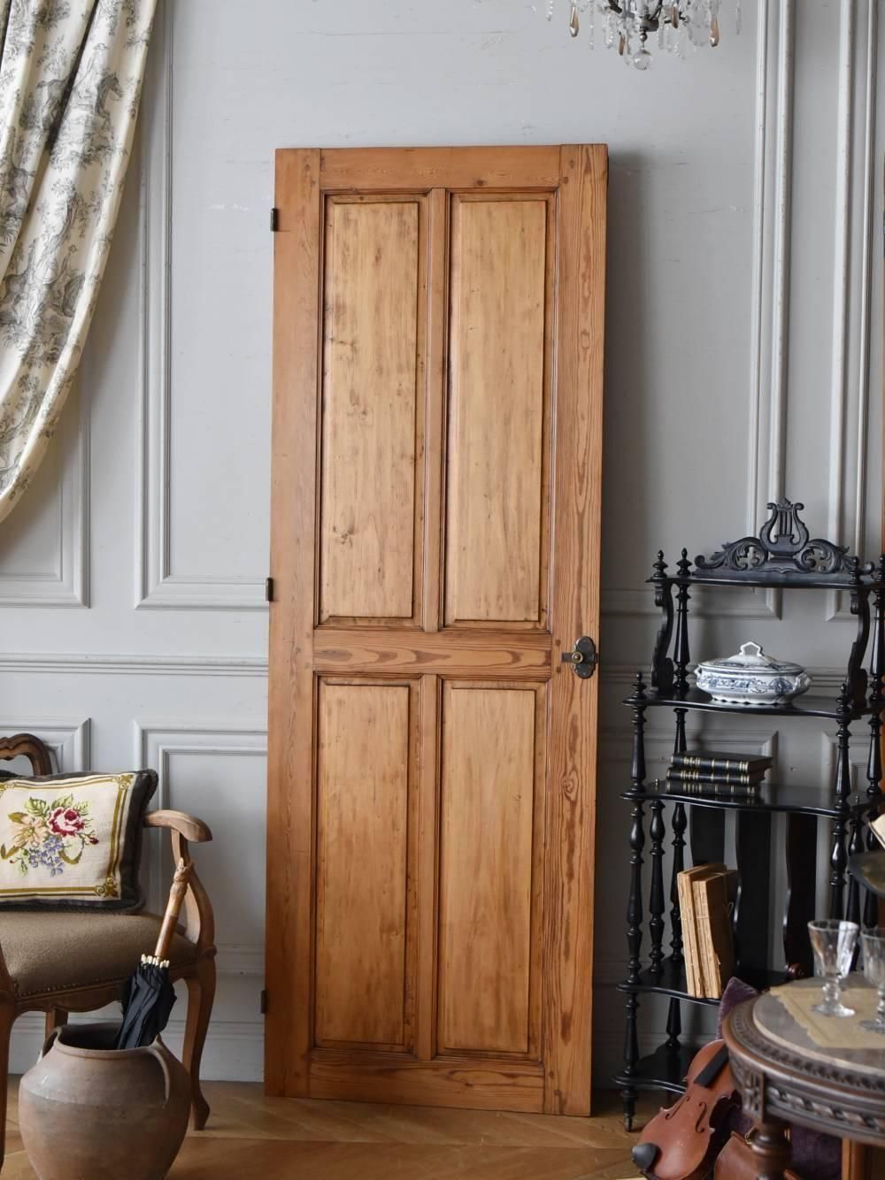 比較的スリムな姿のフレンチパネルドア。 パイン材ならでは流れるような美しい木目に、時を重ねてきた深みのある飴色からほっこりとした親しみを感じ、自然豊かな温もりのある風合いが伝わってくるかのようです。長方形に区切られた4つのデザインによってキリッと引き締まった印象を受け、端正なデザインの中にスライド式の鍵がアクセントとなり、洗練されたかっこよさを感じさせてくれます。 それぞれでの販売となりますが、同じデザインの パネルドアが合計4点あります。壁面にずらりと並べてスタジオなどの撮影背景として使用するのも、壁面をいつもと違った雰囲気を変える事が出来るのでおすすめです。 W 約71.5cm D 約4cm (扉のみのD 約2.5cm) H 約203.5cm 搬入経路について こちらの商品の配送について