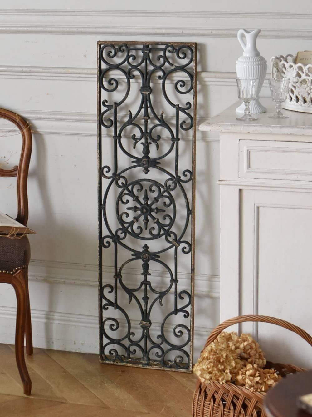 フランスのアイアンパネル。 丸く区切られた中央のデザインからシンメトリーになった幾何学的なデザインが印象的で、曲線が多用された優雅さを纏っています。深みのあるグリーン塗装の剥がれや、クリームカラーのペイントが付いていたりと受け継がれてきた唯一無二な風合いが窺え、しっかりとした厚みが重厚感を漂わせてくれます。 スリムな姿は縦横どちらでもバランス良く使用していただけます。まるで絵画のように壁面に立て掛けているだけでもインパクトがあり、お庭などで植物を絡ませるのもおすすめです。 W 約31cm D 約2cm H 約102.5cm 重量 約10kg