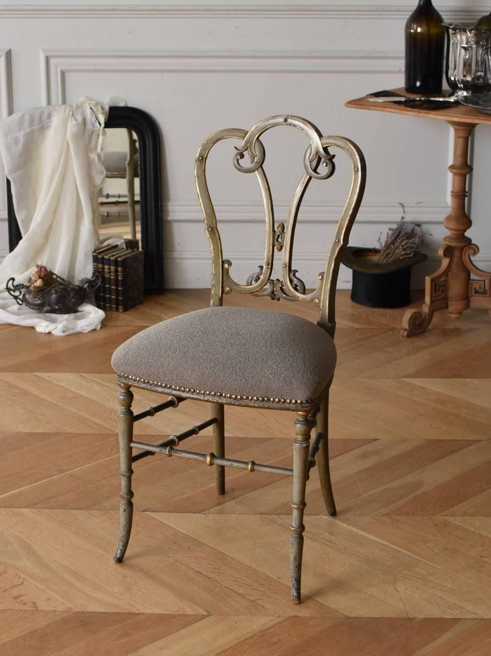 フランス・ナポレオン3世時代のアンティークチェア。 蔦性の植物を連想させる流れるような曲線が描かれ、幅のあるラインが絡み合うような力強さと柔らかさを兼ね備えたデザインとなっています。華奢でしなやかな脚や貫部分に節のようなデザインがリズミカルにあしらわれ、モスグレーのような深みのある色味にゴールドのラインが入った配色は、エレガントな中にもシックな雰囲気を演出してくれそうです。 フレームは一度バラしてから組み直しを行っております。ファブリックも新しい生地で張り替え、中もウレタンに交換し、程よい柔らかさを感じるような座り心地です。 W 約43cm D 約46cm H 約85.5cm 座面までH 約48cm