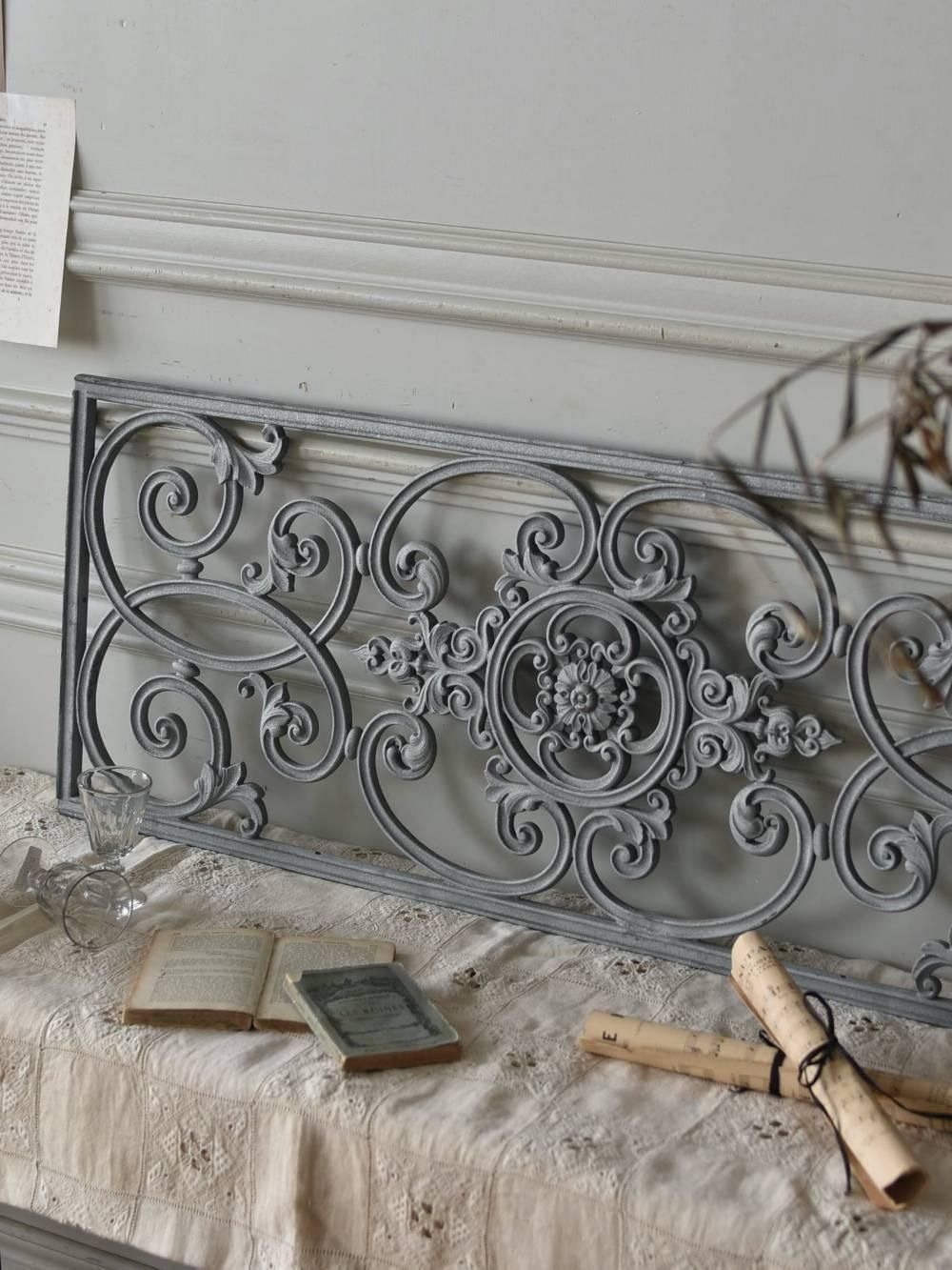 細やかな造形が素敵なフランスのアイアンパネル。 淡く柔らかなブルーグレーカラーにペイントされており、ややざらりとした表面の質感が特徴的。しなやかな曲線ラインと繊細な植物装飾が美しく、優雅でロマンチックなフレンチスタイルにも映える上品なデザインです。スリムなシルエットで縦横どちらでもお使いいただけるシンメトリーな姿も魅力の1つ。 鋳物製ならではのどっしりとした重厚さと、陰影さえも美しい造形美が空間の雰囲気をぐっと高めてくれるアイテムです。 状態は異なりますが、同じデザインのものがもう1点ございます(アイアンパネル)。 W 約97cm 厚み 約2cm H 約37.5cm 重量 約12kg こちらの商品の配送について