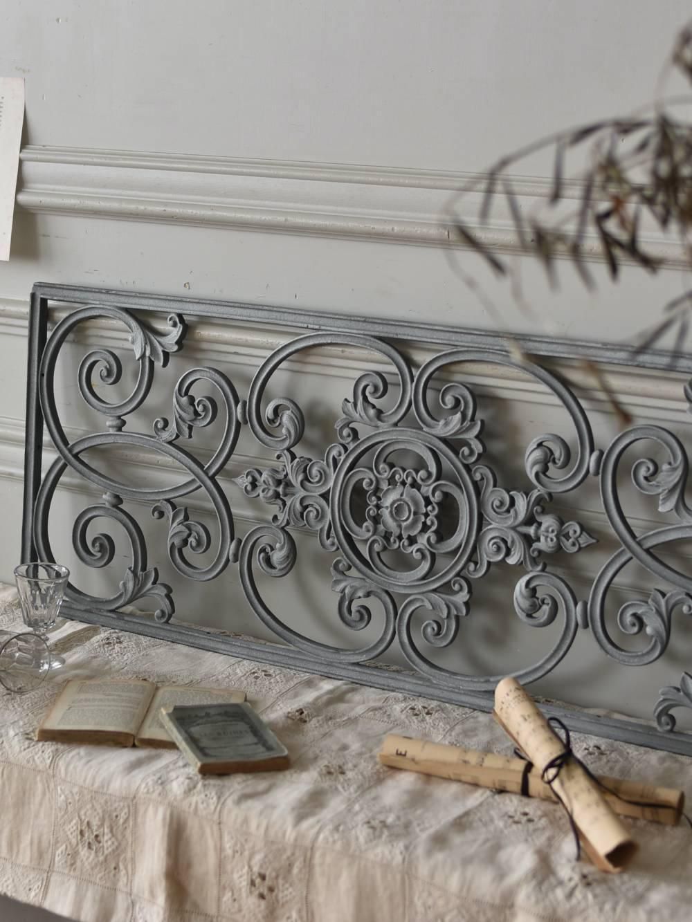 細やかな造形が素敵なフランスのアイアンパネル。 淡く柔らかなブルーグレーカラーにペイントされており、ややざらりとした表面の質感が特徴的。しなやかな曲線ラインと繊細な植物装飾が美しく、優雅でロマンチックなフレンチスタイルにも映える上品なデザインです。スリムなシルエットで縦横どちらでもお使いいただけるシンメトリーな姿も魅力の1つ。 こちらは装飾部に欠けが見受けられます。 鋳物製ならではのどっしりとした重厚さと、陰影さえも美しい造形美が空間の雰囲気をぐっと高めてくれるアイテムです。 状態は異なりますが、同じデザインのものがもう1点ございます(アイアンパネル)。 W 約97cm 厚み 約2cm H 約37.5cm 重量 約12kg こちらの商品の配送について