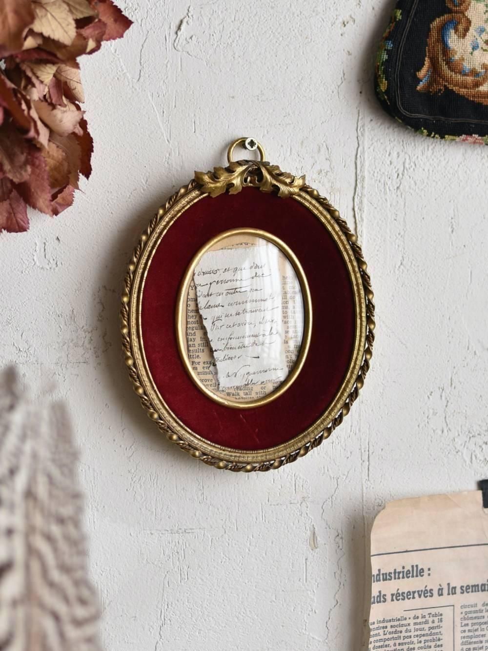 フランスのオーバルフォトフレーム。 ゴールド×ワインレッドの配色がシックで落ち着きのあるクラシカルな印象の佇まい。植物を繊細に模したトップレリーフやくるりと捻られたような縁装飾がアクセントとなったデザインで、内側表面にやや起毛がかったファブリックが貼られた質感の異なる表情が魅力の1つとなっています。背面上下のネジを回して背板を外し、中の写真や作品を入れ換える構造に。 中央にはめ込まれたガラスはぷくっと膨らんだドームシルエットで、中に飾ったものをより素敵に演出してくれるアイテムです。 ディスプレイで使用したペーパーは付属しません。 W 約13cm D 約2.3cm H 約15.3cm(+金具1cm) 内寸 W約6.5cm×H約8.2cm