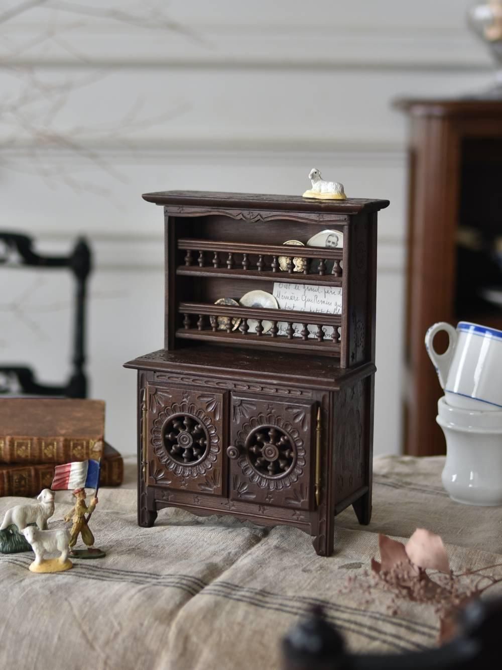 通常サイズをそのままぎゅうっと縮めたような精巧な作りで、こっくりとした深みのあるブラウンカラーがシックな印象の佇まい。海を愛するブルトン人ならではの『船の舵輪』をモチーフとした円盤状の透かし彫りやスピンドル装飾などのアイコニックなデザインがパッと目を惹きます。上部の柵内側には小さなお皿を並べるための溝があったり、下部の扉はノブを回してロックすることもできる細部までこだわった構造が魅力の1つに。
