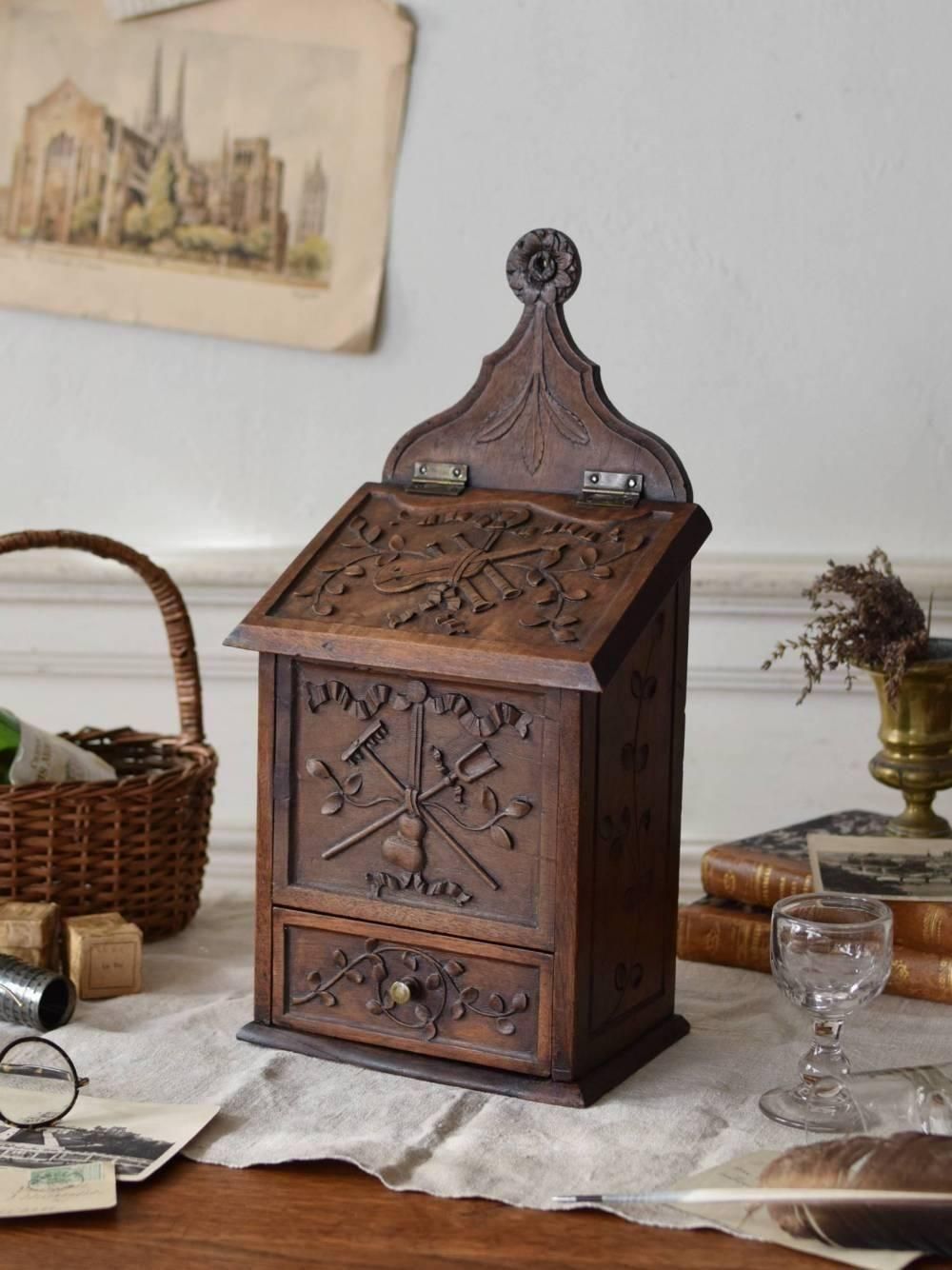 フランスのアンティーク小物入れ。 正面には楽器や農具をモチーフとした繊細な彫りが施され、リボンや植物がリズミカルに舞う、一目見たら忘れられないユニークなデザインと作りが印象的。元々は、塩を入れるために使われていた壁掛け式の木製の収納ボックスですが、現在は、レターラックなどとして活用するのもおすすめ。小さな引き出しもついており、使い勝手も十分です。 手仕事ならではの味わいを感じるとともに、存在感のあるディスプレイとして活躍します。 W 約20.5cm D 約13cm H 約40.5cm 上部収納内寸 W約15cm×D約10cm×H約12.5~19cm 引き出し内寸 W約13.4cm×D約8.8cm×H約5.2cm
