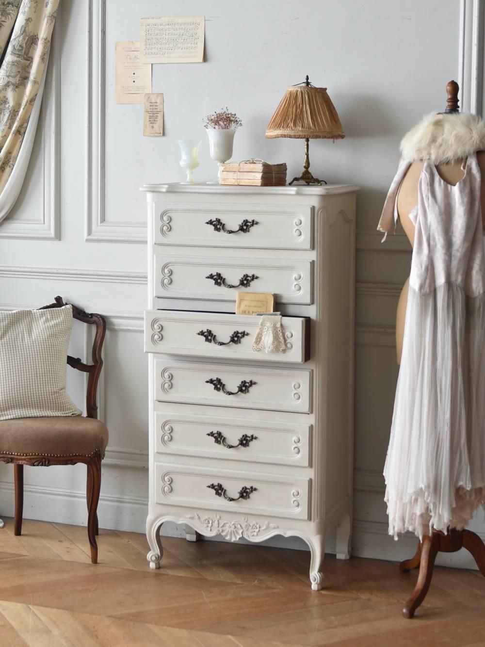 柔らかで上品な色味にペイントされ、植物をモチーフとした繊細な装飾取手がアクセントとなったデザイン。なめらかな曲線を描く天板や脚元、シェルなどの優雅な彫り装飾、小さな猫脚などフランスらしいエレガントな造形が魅力的です。引き出しは6杯もうけられ、細かく仕分けて収納できる機能的にも優れた逸品に。