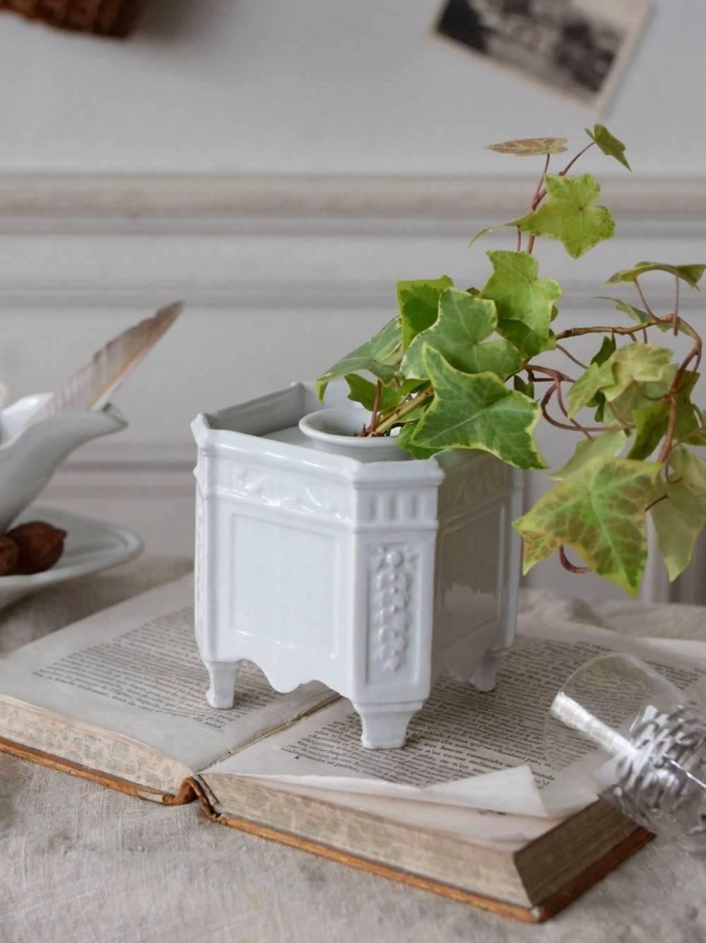 フランスのヴィンテージフラワーベース。 プランターのような角形で、上部に穴の空いた蓋がついたユニークな姿です。清楚な白磁器で、側面にはさりげないレリーフが施され、エレガントな雰囲気。水耕栽培にちょうどよく、室内でも気軽に観葉植物やお花などを楽しんでいただけます。 ところどころ釉薬の剥がれや脚元に欠けなどが見られますが、古いものならではの風合いをお楽しみください。ユニークなデザインを活かして、ポプリやオイルなどで芳香を楽しむのも良いですね。 W 約11cm D 約11cm H 約11cm 口径 約3cm
