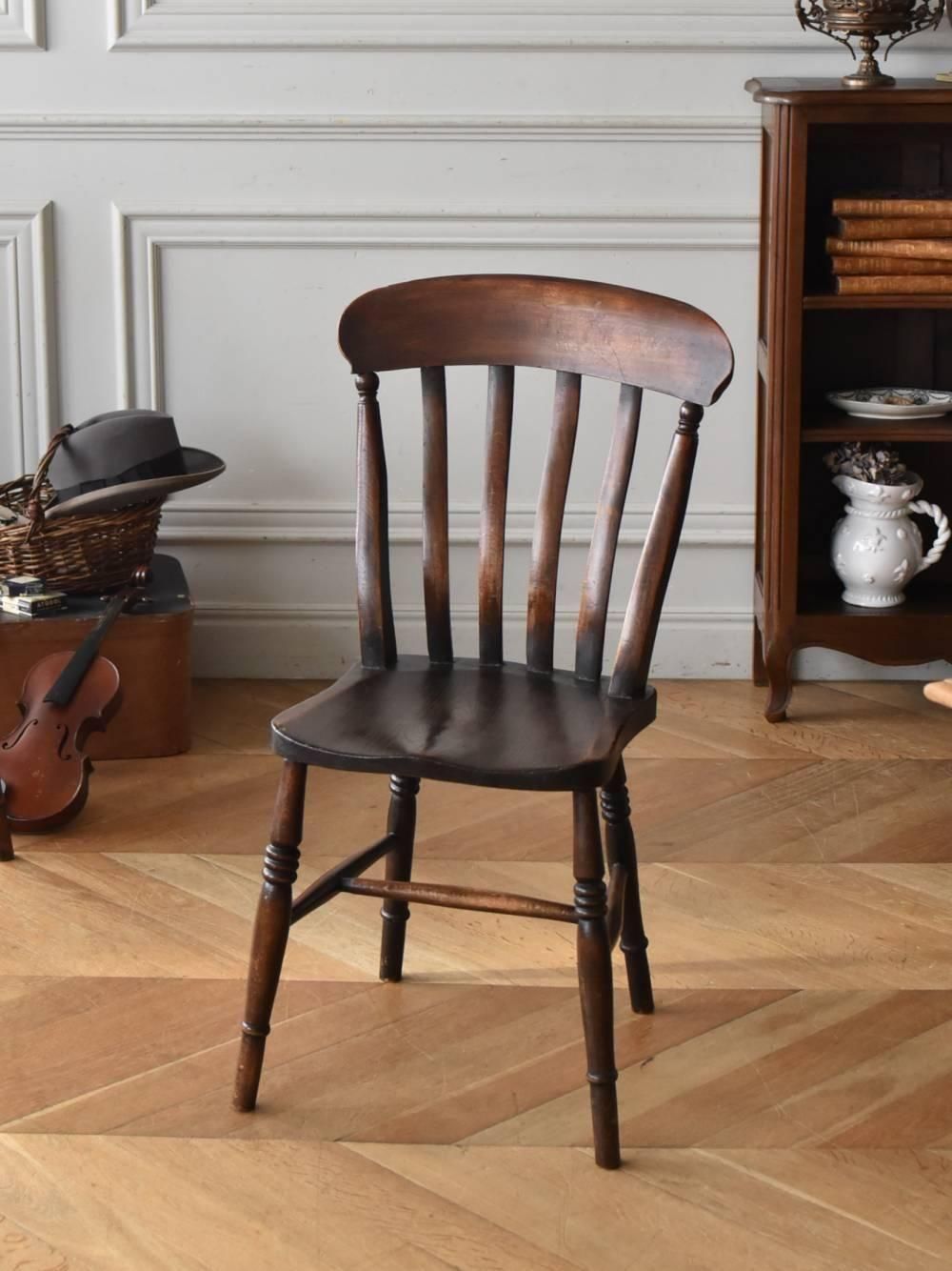 イギリスのウィンザーチェア。 しなやかなカーブを描いた背もたれはしっかりとした幅のあるラインで構成されたどっしりとした安定感のある姿で、サイドの丸い形状がアクセントとなったポップな一面も楽しめます。深いブラウンカラーが薄くなっている箇所などに経年による豊かな風合いが感じられ、細やかな細工や程よい重厚感が味わいのある佇まいです。 パーツ毎に全て分解してから組み直しを行なっており、脚元中央には膨らみのある貫もあしらわれたしっかりとした作りです。それぞれでの販売となりますが、同じデザインのウィンザーチェアがございます。 W 約47cm D 約47cm H 約87.5cm 座面までH 約43.5cm