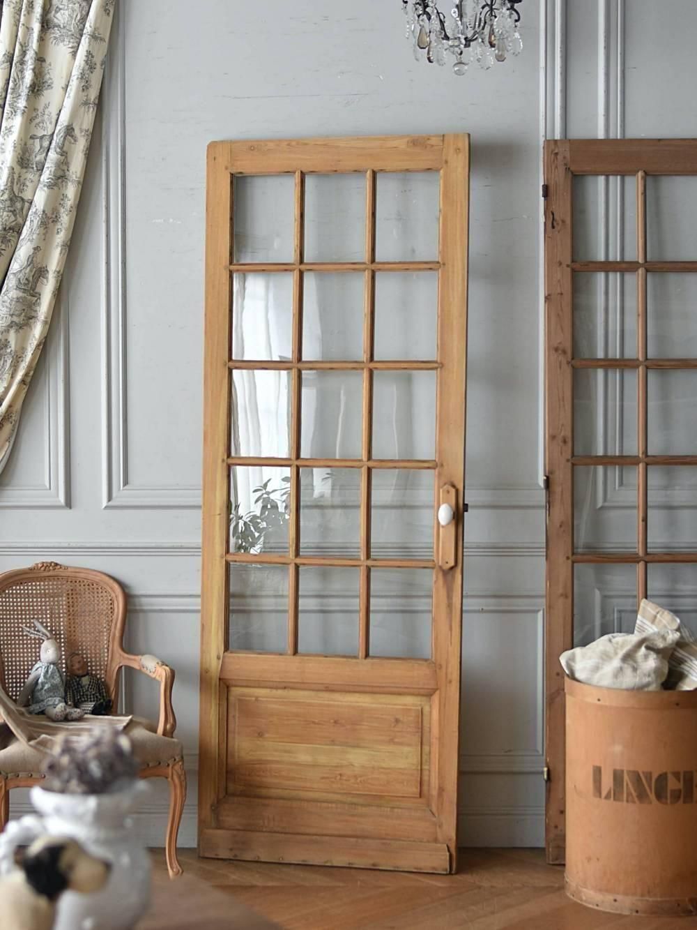 光をたっぷりと取り込んでくれるフランスのガラスドア。 明るい木製フレームがナチュラルな姿で、どこか温かみのあるほっこりとした素朴な印象の佇まい。金属×陶器のハンドルや表面にあしらわれたシンプルなモールディングが魅力の1つで、格子状になったガラス窓のデザインがちょっぴり可愛らしい表情を覗かせます。ドアノブ・ラッチは現在も動きます。 古いものならではの趣豊かな木の質感や濃淡が深みを演出し、スタジオなどの撮影背景としてもおすすめのアイテムです。 ノブのデザインが異なりますが同じシリーズのものがもう1点ございます(ガラスドア.2A)。 W 約79.5cm D 約3.5cm(金具含む厚み 約15.5cm) H 約215cm 搬入経路について こちらの商品の配送について