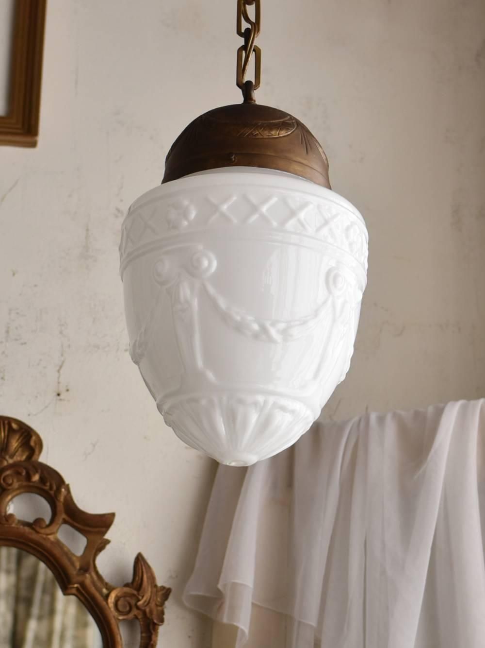 フランスの1灯ペンダントランプ。 お花の蕾を連想させるような丸みのあるフォルムで、優しげなホワイトのガラスシェードに光が包み込まれるような可憐な姿です。ぷっくりと立体的になったガーランドや植物のモチーフが光によって美しく浮かび上がり、真鍮で出来た繊細な細工の上部装飾も豪華さを漂わせてくれます。 コード・ソケット・シーリングは新しいものに交換済み。こちらは条件を満たしているので引掛シーリングをご使用いただけます。元は直付けで使われていた物で天井カバーが浅い為、天井との間に隙間ができます。天井との隙間が気になられる方は直付け工事をおすすめします。 電球は付属しません。 直径 約22cm H 約38cm コード含む全長 約54m 重量 約1.5kg 電球口径 E17 *60W以下をご使用下さい。