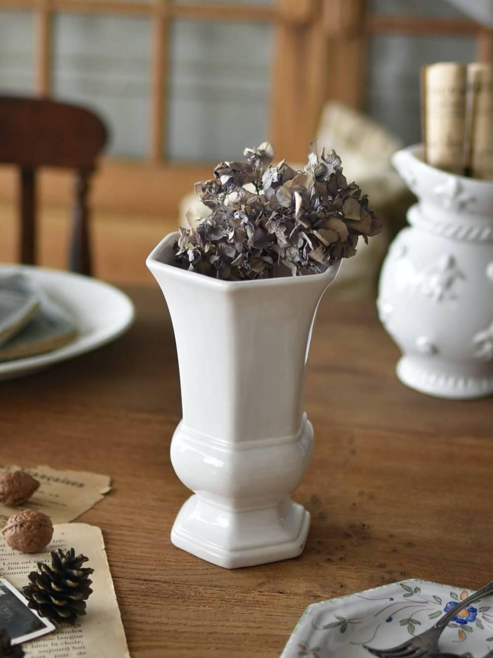 艶やかな白釉が美しいフラワーベース。 フランス陶器の名産地ムスティエにあるラリエ窯のもので、ぽってりとした厚みのあるボディが特徴的。多面体のようなフォルムが魅力の1つで、可愛らしすぎない凛とした姿が飾ったお花をより素敵に魅せてくれます。"Lallier Moustiers"と鮮やかなブルーのインクで手描きされた特別感のある逸品に。 華美な装飾のないシンプルなデザインがスタイリッシュで、雰囲気ある卓上ディスプレイを演出してくれるアイテムです。 W 約14cm D 約12cm H 約21cm