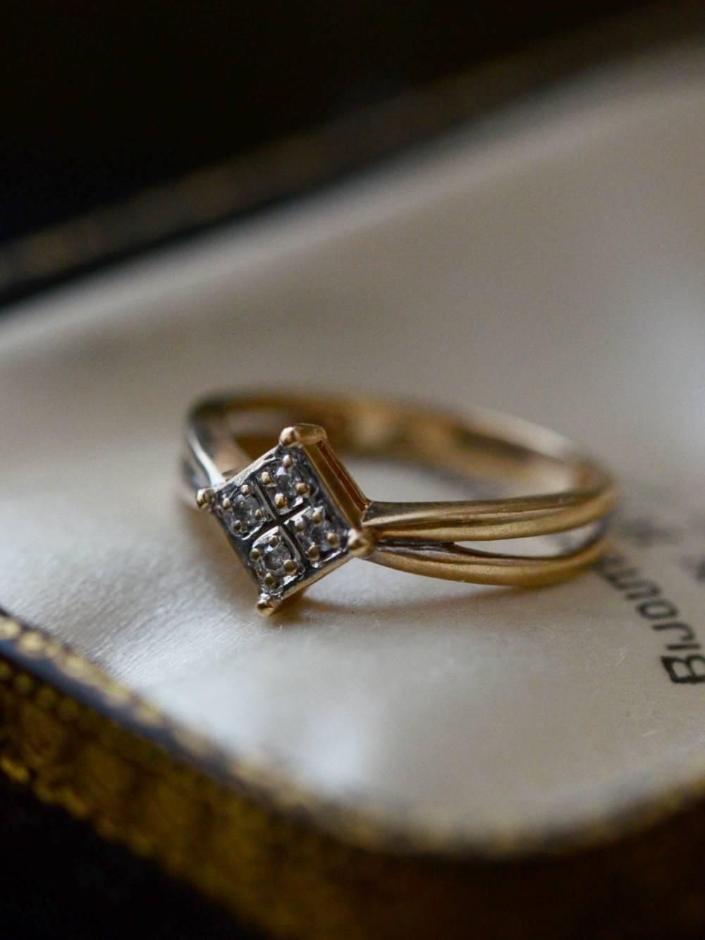 菱形に収まった4粒のダイヤモンドが上品に煌めき、パールモチーフのようになった爪がエレガントさを増します。リングは2本のラインがふっくらと膨らむように繋がっており、柔らかな曲線が描かれた抜け感をもたらしながら程よいボリュームもあるデザインとなっています。