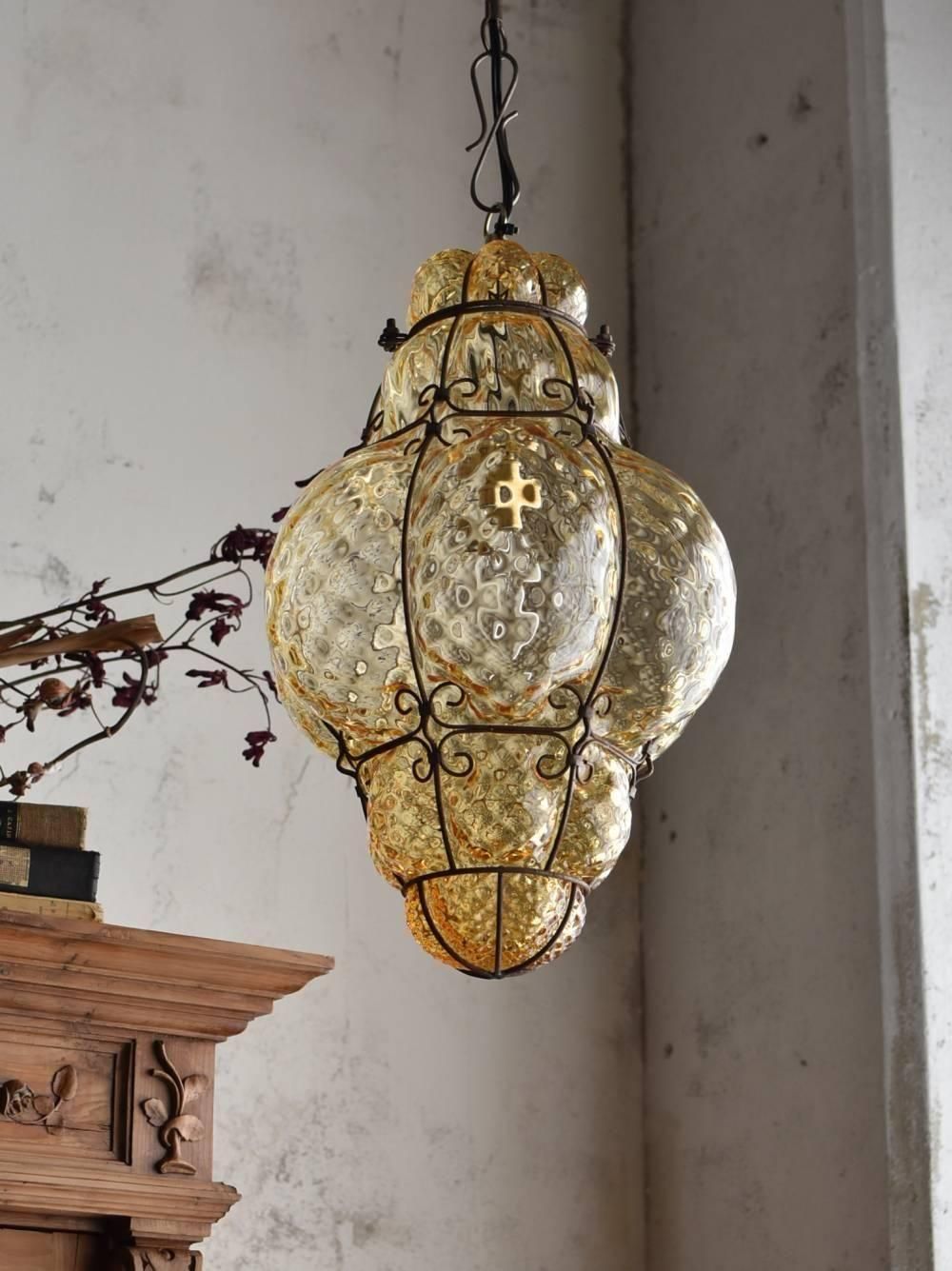 イタリアのムラーノガラスランプ。 アイアン製フレームの華奢なラインと、風船のようにぷっくりと膨らんだガラスのシルエットが個性的で、ポコポコとした凹凸のあるガラスが光の反射によって美しく引き立ちます。ほんのりとブラウンに色づいた姿はクラシカルな雰囲気を纏い、グラデーションのようになった濃淡のある表情も幻想的です。 コード・ソケット・シーリングは新しいものに交換済み。こちらの商品は条件を満たしているので引掛シーリングをご使用いただけます。元は直付けで使われていた物で天井カバーが浅い為、天井との間に隙間ができます。天井との隙間が気になられる方は直付け工事をおすすめします。 電球は付属しません。 直径 約24cm H 約43cm コード含む全長 約66cm 重量 約2.4kg 電球口径 E17 *60W以下をご使用下さい。