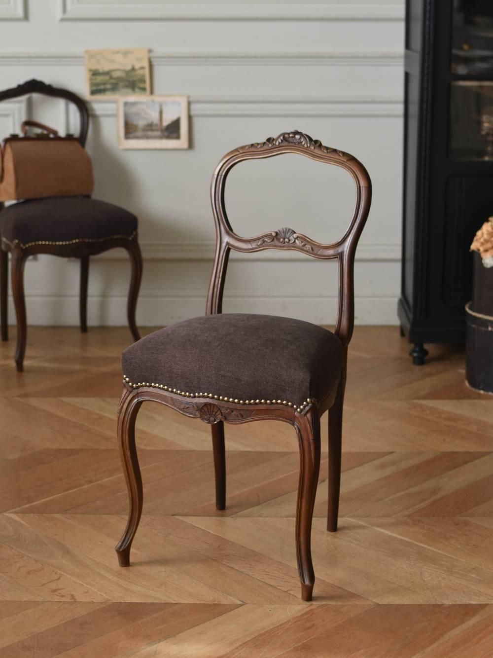 こっくりとしたブラウンカラーのフレームは上品な艶感で、しなやかな曲線を描くシルエットが優美な佇まい。シェルや植物などを模した細やかな彫り模様が散りばめられており、フランスらしいエレガントな空間演出に活躍してくれるデザインです。