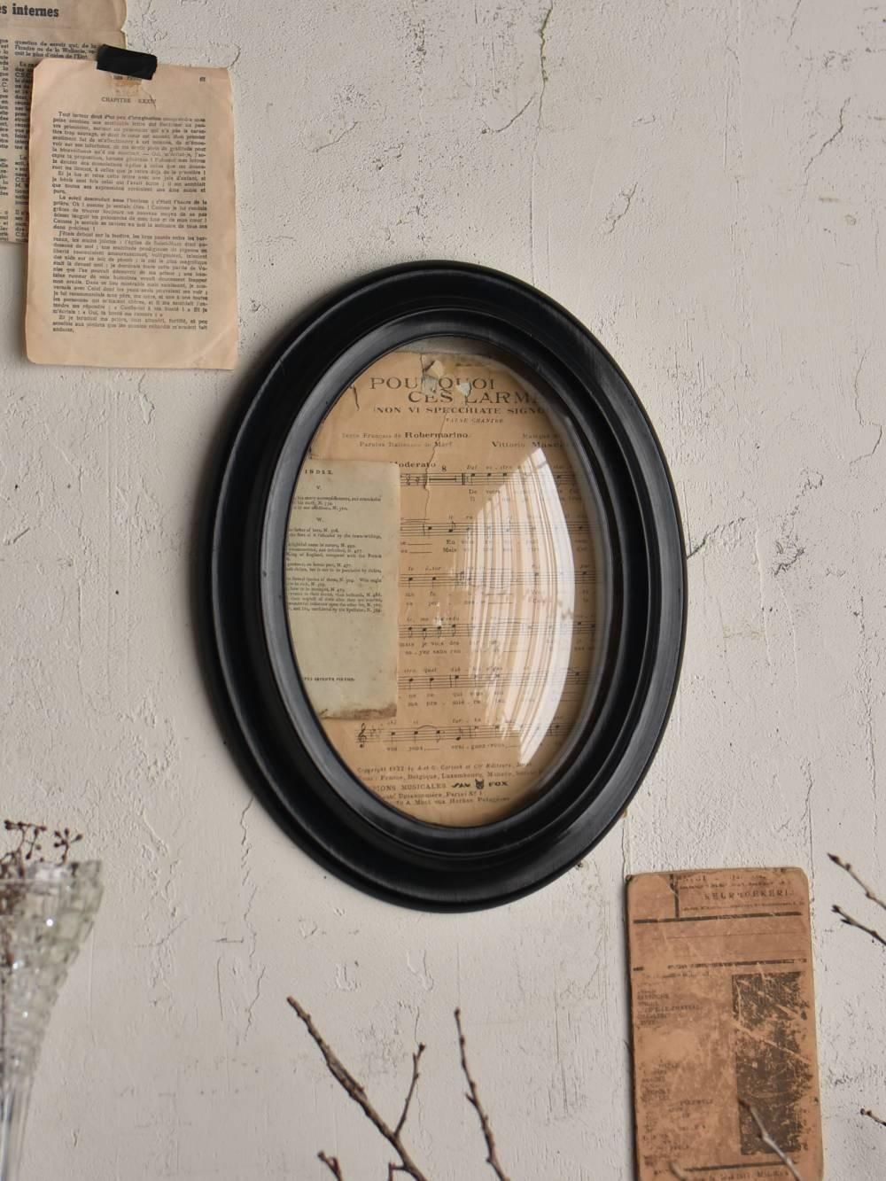 クラシカルな装いが魅力的なフランスのガラスドームフレーム。 程よい艶感のあるブラックカラーのフレームは凹凸のはっきりとした造形で、壁面に奥行きを出してくれるデザイン。ぷっくりと膨らんだドーム状のガラスが特徴的で、古いものならではの揺らめきが深みのある姿となっています。滑らかなラインを描くオーバルシルエットがどこか優しげな印象をもたらしてくれる逸品に。 内側に空間ができるガラスドームはやや立体的なアイテムも飾ることができ、壁面をより素敵に演出してくれるアイテムです。 ディスプレイで使用しているペーパーは付属しません。 W 約28.3cm D 約6.5cm H 約36.5cm 内寸 W約18.5cm×H約27cm