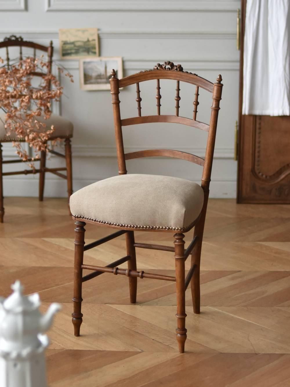 フランスのアンティークチェア。 柔らかなブラウンのフレームに淡いベージュカラーの座面が優しげで温かみのある佇まい。華奢なラインで構成され、トップにあしらわれた繊細なリボン装飾がフランスらしい可憐な印象をもたらしてくれるデザインです。フレームは一度バラして組み直しを行っています。座面のファブリックは新しく張り替え、中もウレタンに交換しているので程よい沈み込みのある座り心地に。 同じデザインのチェアと揃えてのお使いも空間にまとまりが出ておすすめです。 W 約42cm D 約42cm H 約92cm 座面までのH 約51.5cm