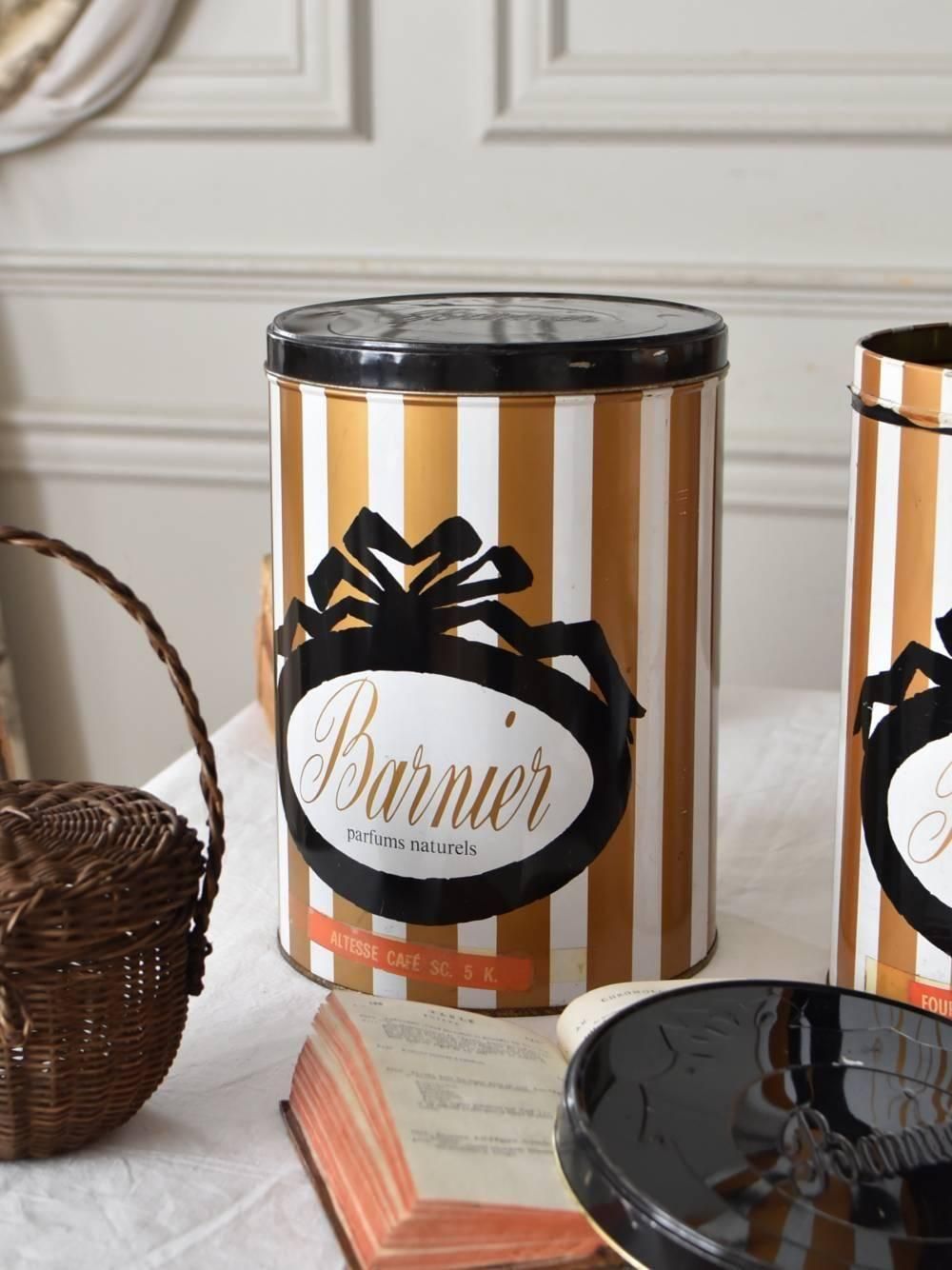 大きなリボンデザインが特徴的なフランスのブリキ缶。 1885年創業の菓子メーカーBarnier社のもので、業務用もしくはプロモーションとして使用されていたものです。比較的大きめサイズの筒型でストライプ柄がポップな印象ながらもブラックカラーの蓋とリボンの模様によって引き締まり、上品さも兼ね備わっています。 置いているだけでも可愛らしいディスプレイが楽しめ、それぞれの販売となりますが他のブリキ缶と並べたり、鉢カバーとして使用するのもおすすめです。 直径 約20.5cm H 約28.5cm