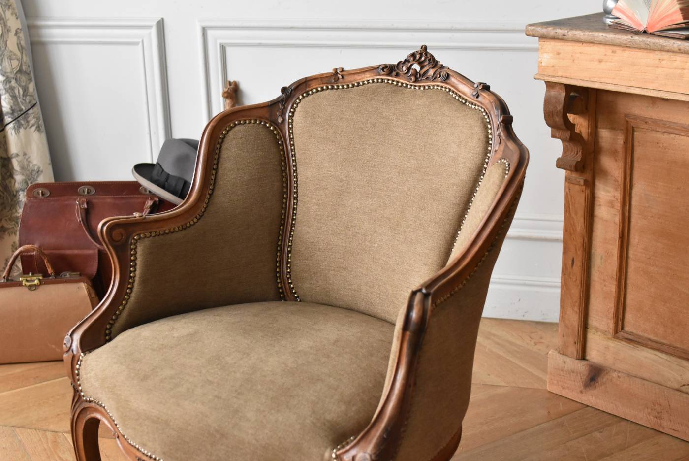 フランス1900年頃のアンティークシングルソファ。 捻りを加えられたような美しい曲線が描かれたシルエットが圧巻で、随所に散りばめられたシェルモチーフのレリーフが繊細で気品高い佇まいです。背もたれから肘置き、脚先までが流れるようなラインで繋がったような、どこからの眺めからもフランスらしい優美さを演出してくれます。 フレームは一度バラしてからしっかりと組み直しを行っています。ファブリックは新しく張り替え、中もウレタンに交換しており、そっと包み込んでくれるようなしっかりとした張りのある座り心地です。 W 約68.5cm D 約72.5cm H 約85cm 座面までのH 約41cm 搬入経路について こちらの商品の配送について
