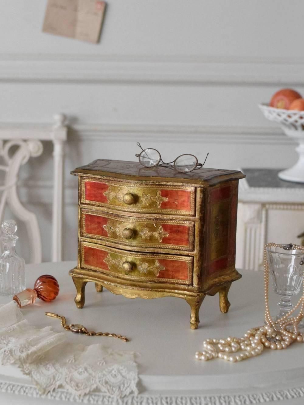小さなサイズがかわいいイタリア製のチェスト。 こちらは木製で、フロレンタインと呼ばれるフィレンツェ発祥の型押しの技法で作られた工芸品です。美しい模様に合わせ、ハンドペイントで着色されたゴールドとワインレッドの組み合わせがとても華やか。引き出しはスムーズに開閉し、アクセサリーなど小さなアイテムの収納にも活躍します。 古いものですので、傷など多く、表面の塗装の剥がれも見られます。鮮やかな色合いですが、経年による味わいもプラスされ、唯一無二の雰囲気を纏っています。 W 約23cm D 約12cm H 約19.5cm 引き出し内寸 W約14.4cm×D約9cm×H約3.5cm