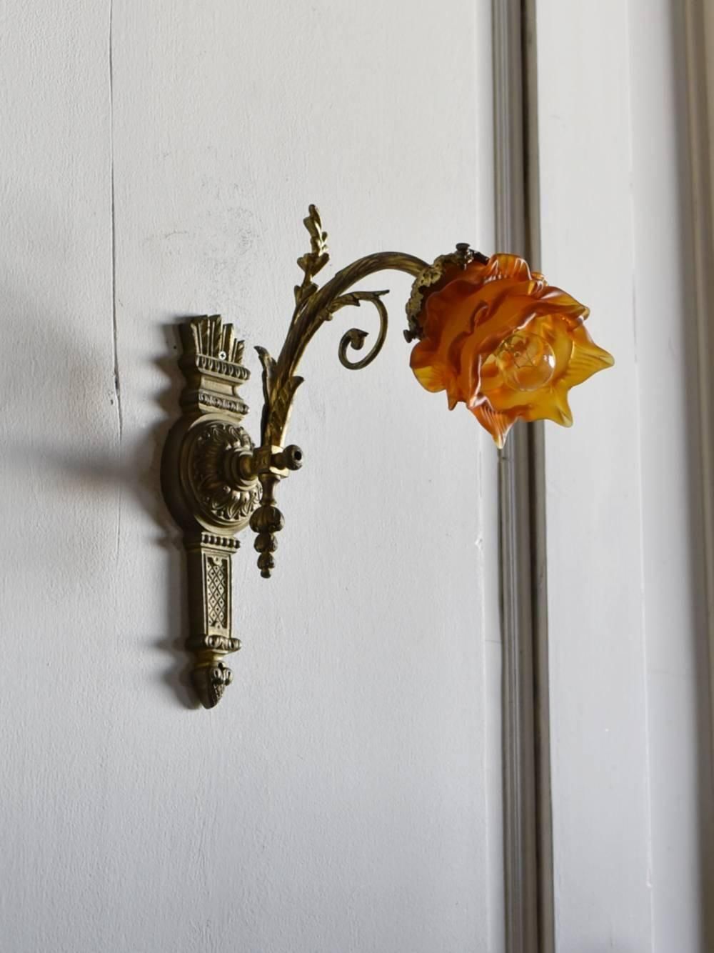 フランスのガラスシェードウォールランプ。 ブロンズならではのどっしりとした重厚感が漂い、細やかなレリーフが豪華に施され、自然モチーフとなった造形に思わず眺めていたくなる程です。アーム部分のくるんと巻かれた繊細なラインなども芸術的で、たっぷりと厚みのあるガラスシェードもたくさんの花びらが合わさったような優雅さが漂います。 アームの歪みや穴が開けられた跡、ガラスの金具取り付け部に小さな欠けが見受けられますが、取り付けると目立ちにくいです。ソケット・コードは新しいものに交換済みです。取り付けの際は配線工事が必要です。 壁に取り付ける為の金具や電球は付属しません。 W 約11cm D 約32cm H 約31.5cm 土台のみ W約8cm×H約26cm 重量 約1.3kg 電球口径 E17 *60W以下をご使用下さい。