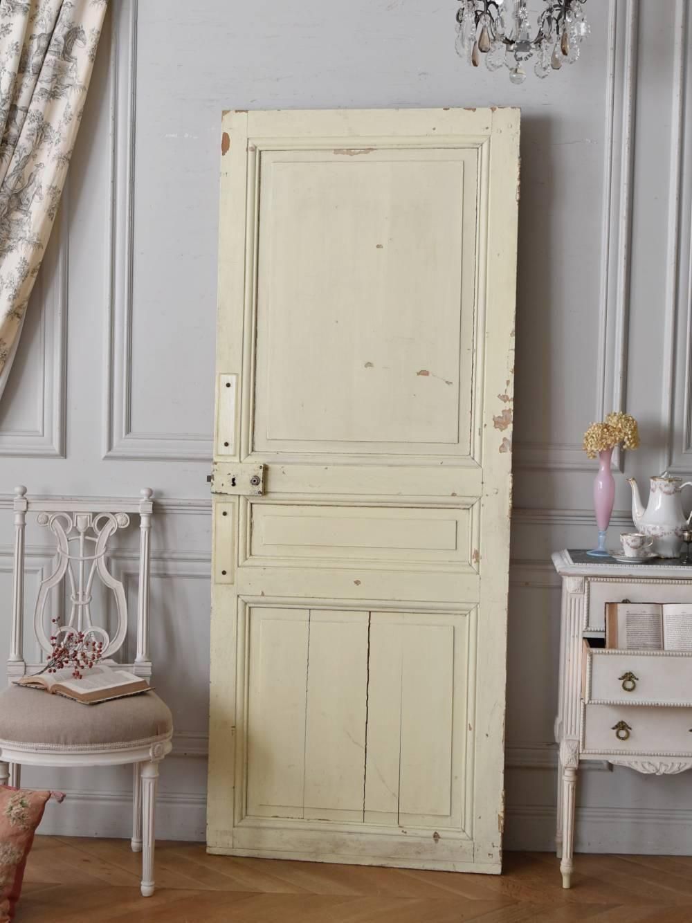 フランスのペイントパネルドア。 黄色味がかった優しげな色合いに、奥行き感のある直線的なモールディングで囲まれ、すっきりとしたスタイリッシュさを感じるデザインです。裏面はガラリと雰囲気が変わった淡いピンクカラーになっており、可愛らしいポップな雰囲気を演出してくれます。 剥がれた箇所から何度も塗装を重ね受け継がれてきた風合いが漂い、落ち着いた印象ながらもシャビーな表情が楽しめます。金具などは異なりますが、同じデザインのパネルドア.Bがあり、撮影背景として並べて使用するのもおすすめです。 W 約79.5cm D 約8cm H 約198cm 搬入経路について こちらの商品の配送について
